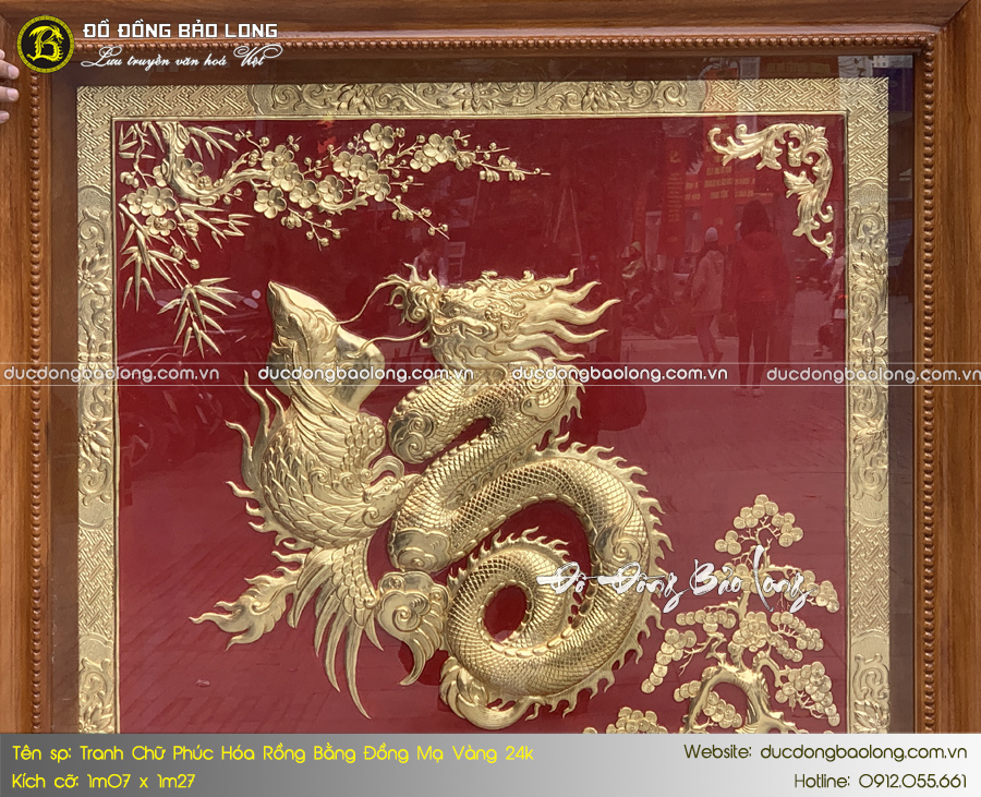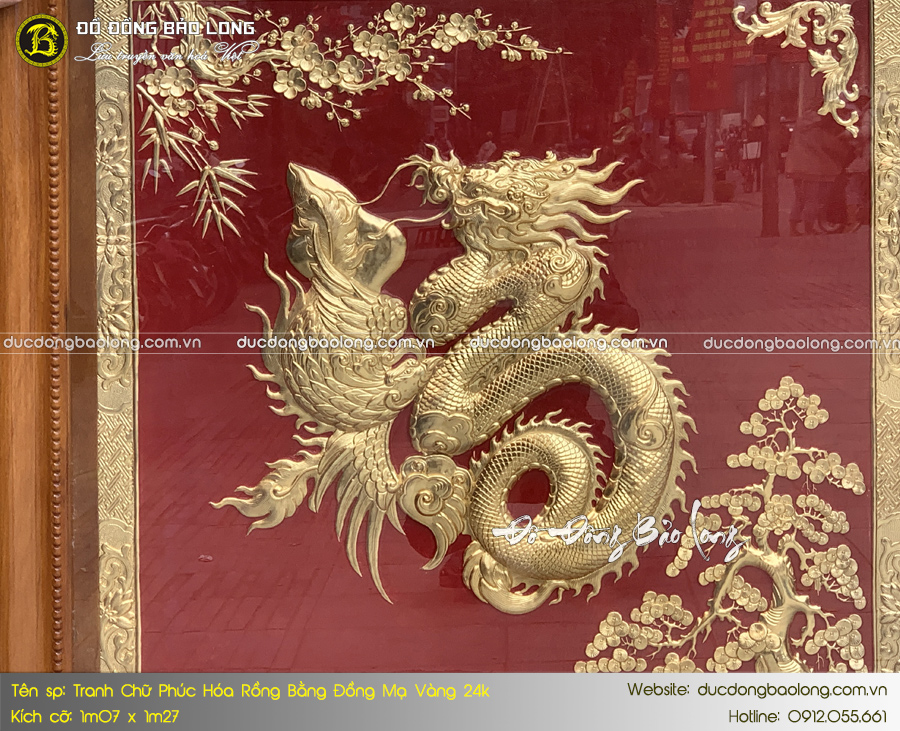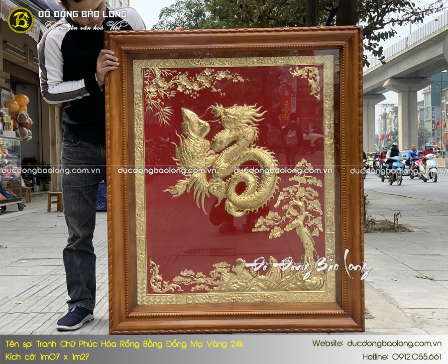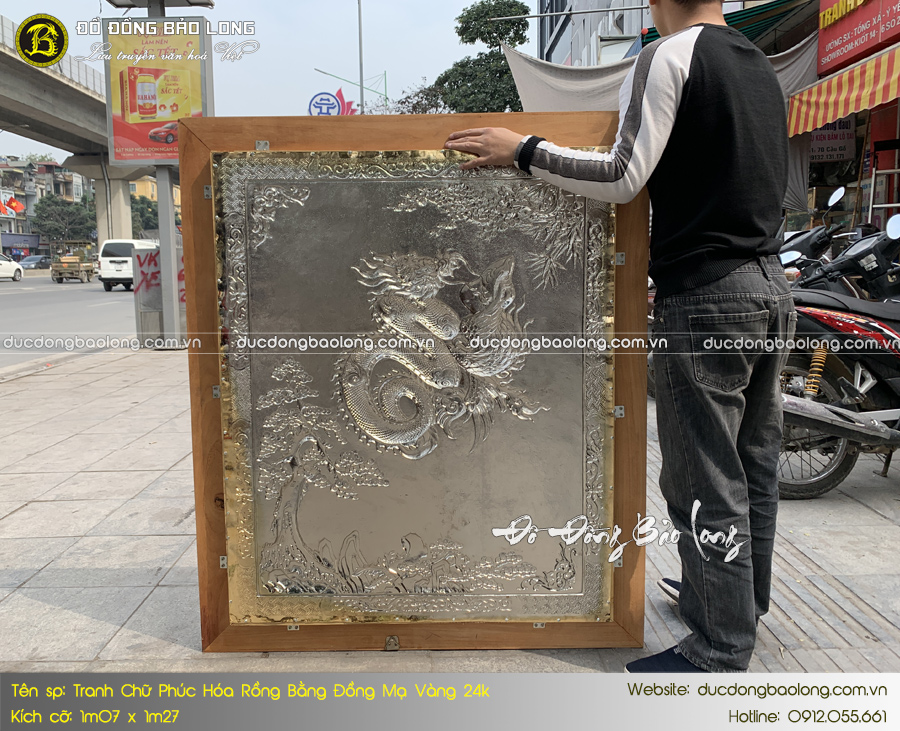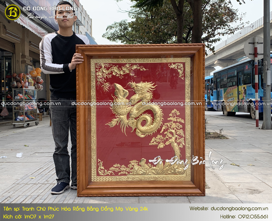Mẫu tranh chữ Phúc Hóa Rồng bằng đồng mạ vàng 24k được chế tác trên tấm đồng nhập khẩu Hàn Quốc độ dày 8 rem đạt chuẩn. Mọi quy trình chế tác tranh được thực hiện nghiêm ngặt, đạt tiêu chuẩn làng nghề. Người nghệ nhân thổi hồn vào từng chi tiết những nét chạm mềm mại, uyển chuyển, toát lên vẻ đẹp chân thực của họa tiết Rồng, chim Phượng.