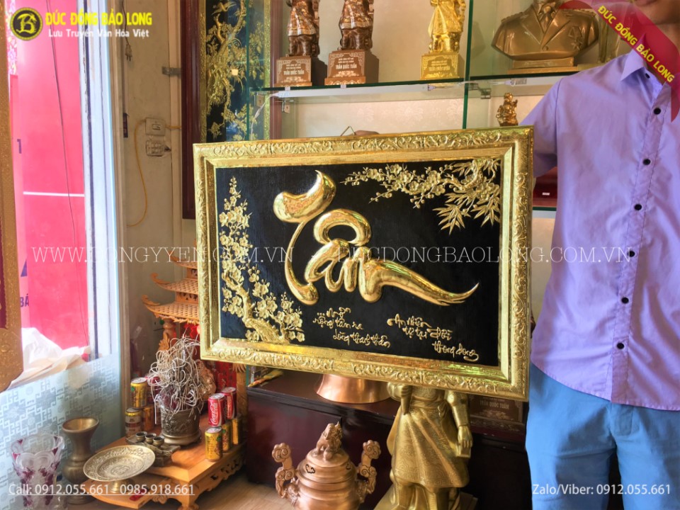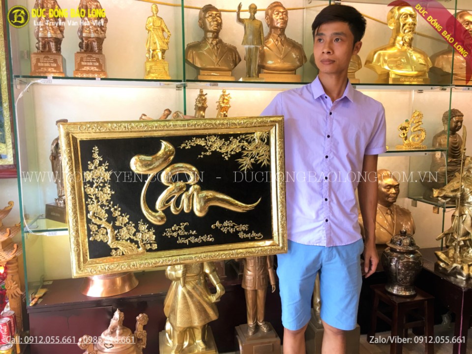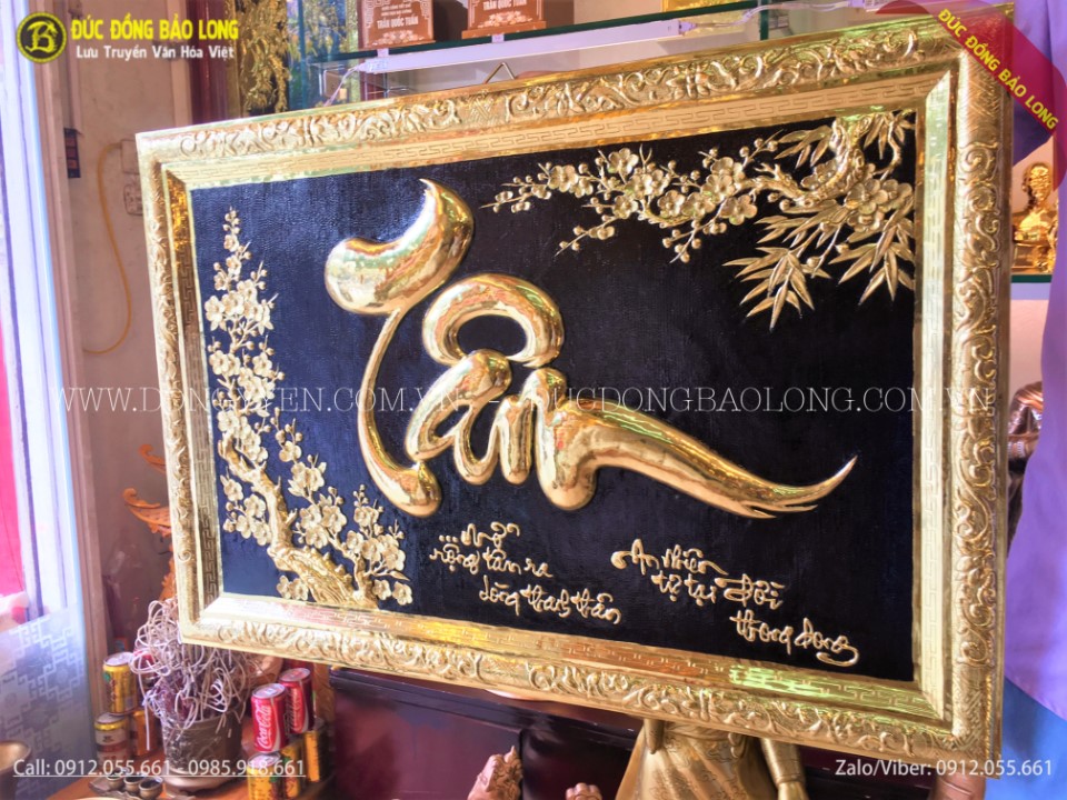 Tranh chữ tâm này được chạm chữ thư pháp, có cảnh cành mai và cành trúc rất đẹp. Tranh rất phù hợp để treo ở phòng khách, phòng làm việc, thư phòng hoặc làm quà biếu tặng rất ý nghĩa. Tranh chữ Tâm được chạm hoàn toàn thủ công theo phương pháp truyền thống, nguyên liệu là loại đồng vàng nhập khẩu Hàn Quốc, đồng dày 8rem, đồng đủ dày để chạm không bị thủng hay lồi lõm. Khung liền đồng, phía sau được thiết kế khung xương inox 304 rất chắc chắn. Tranh có kích thước khổ 81cm x 55cm. Ngoài ra, Bảo Long còn chạm những loại tranh chữ bằng đồng có nhiều kích thước khác nhau để phù hợp hơn với nhiều không gian.