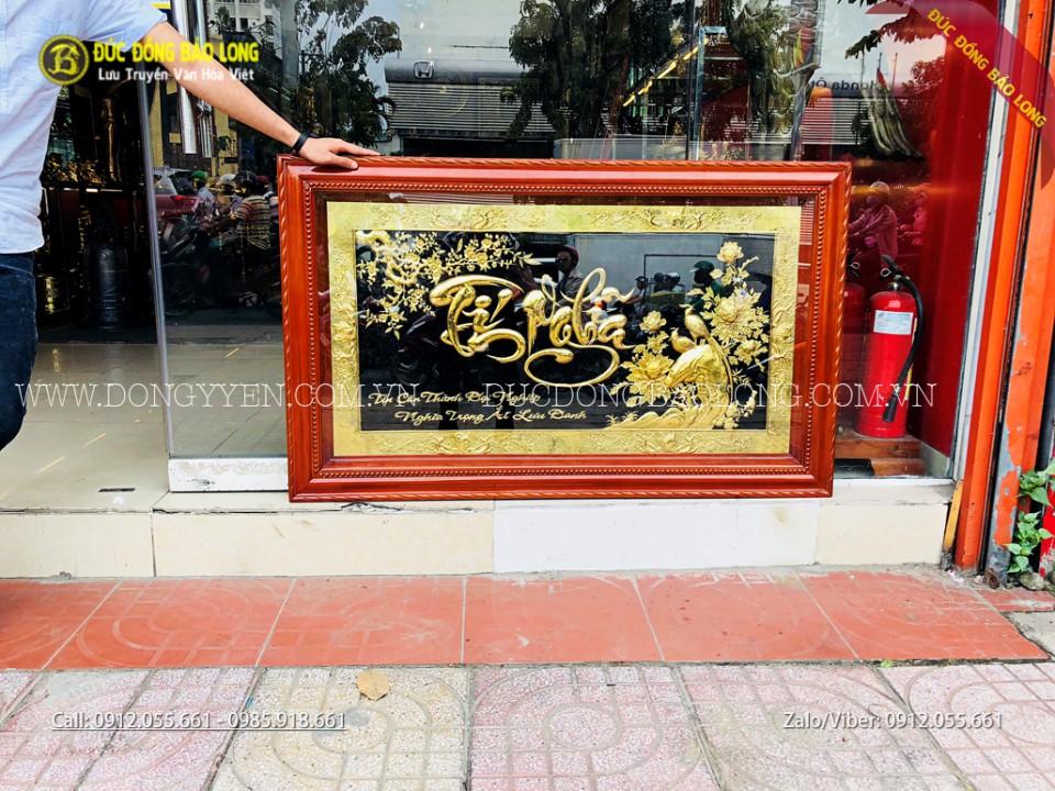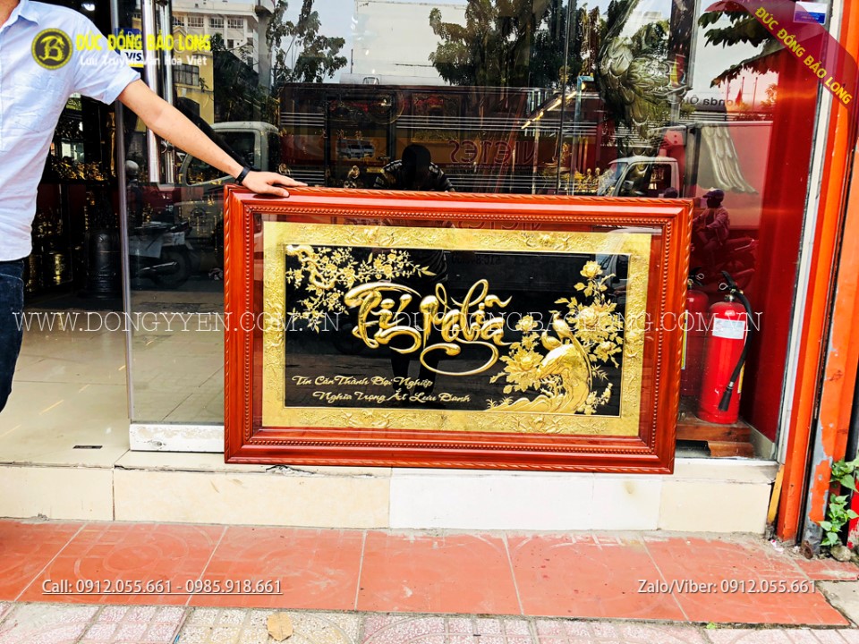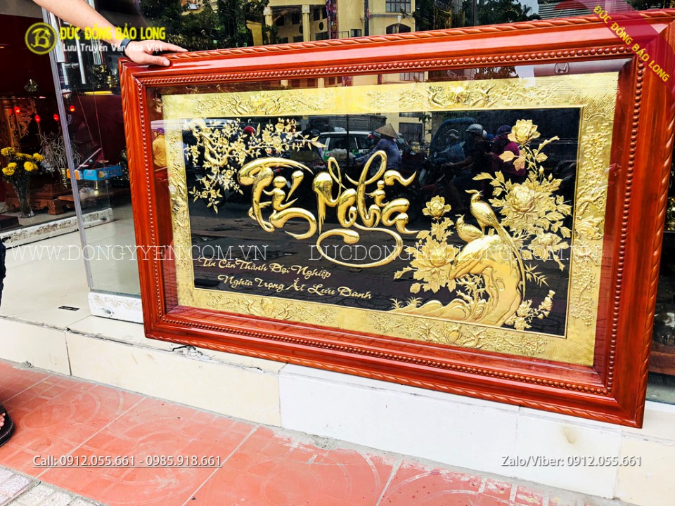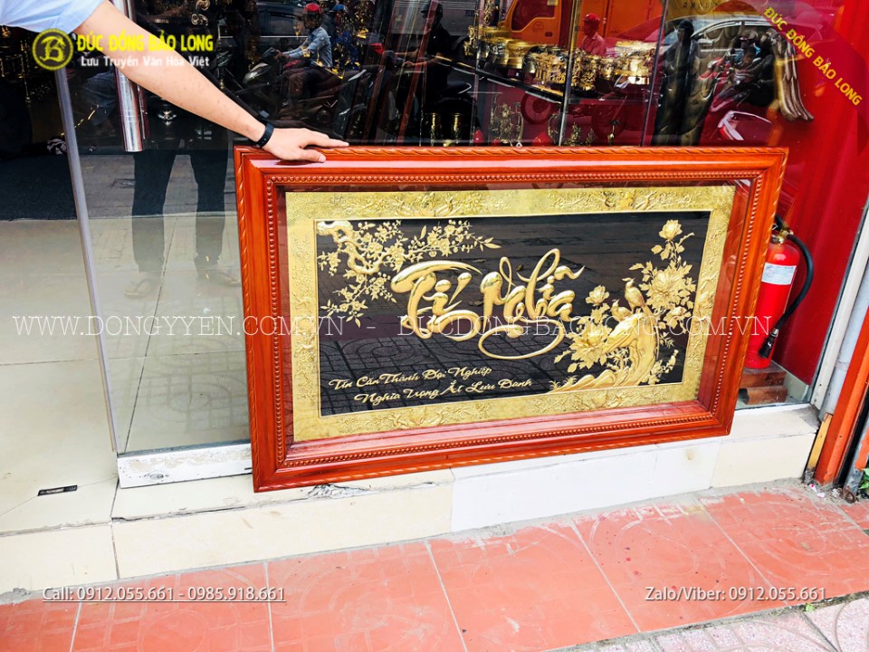 Tranh chữ tín nghĩa bằng đồng dài 1m35, cao 81cm có dạng chữ thư pháp, hoa văn được thiết kế đẹp mắt. Ngoài ra, Bảo Long còn chạm những loại tranh đồng tín nghĩa có nhiều kích thước khác nhau để phù hợp hơn với nhiều không gian.