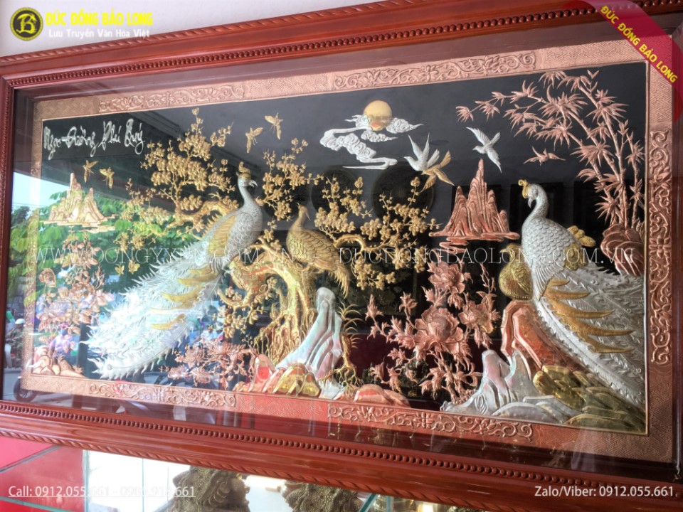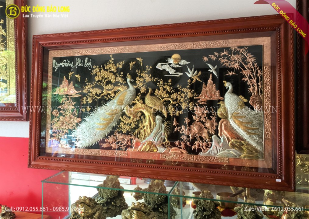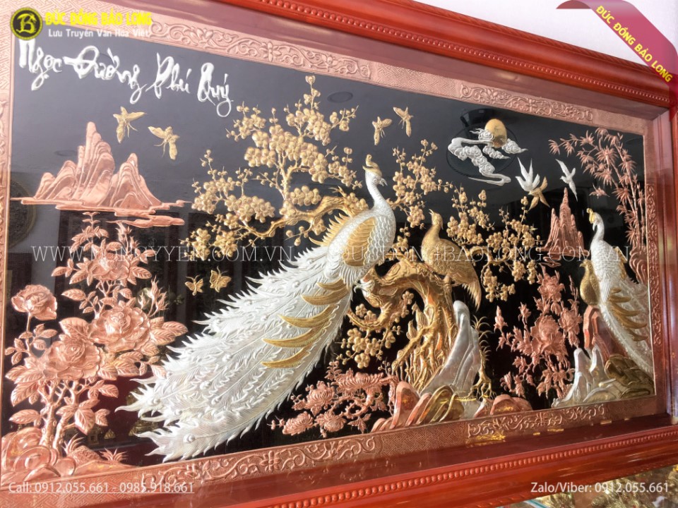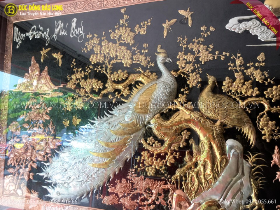 Tranh Công Mai (Ngọc Đường Phú Quý) hay còn gọi là tranh uyên ương thuộc dạng khổ vừa 1m55 theo thước lỗ ban đẹp, được cơ sở Bảo Long chế tác hoàn toàn thủ công bằng đồng đỏ thanh khiết nguyên tấm dày 8rem, đóng khung gỗ trò màu cánh dán. Tranh công mai ngọc đường phú quý được chạm tinh xảo, sắc nét theo mẫu thiết kế riêng. Tranh Công Mai này cũng giống như những bức tranh cao cấp khác mà Bảo Long đã dày công chế tác, nó được áp dụng công nghệ mạ điện phân cao cấp nhất. Đây là 1 bức tranh tam khí thực thụ với 3 kim loại quý là đồng, bạc và vàng. Việc phối kết màu cũng là một nghệ thuật đáng khâm phục, với màu trắng điểm của bạc, màu chủ đạo của vàng 24k và màu đồng đỏ nguyên bản của phôi tranh thực sự đã làm cho bức tranh hết sức sinh động, đẹp mắt và sang trọng vô cùng. Khung tranh được làm từ gỗ gụ hoặc trò chỉ, đôi khi là gỗ hương đỏ hoặc gỗ óc chó tùy vào yêu cầu của khách hàng, gỗ phải được tuyển trọn kỹ lưỡng để không bị lỗi, vân đều, màu đẹp.