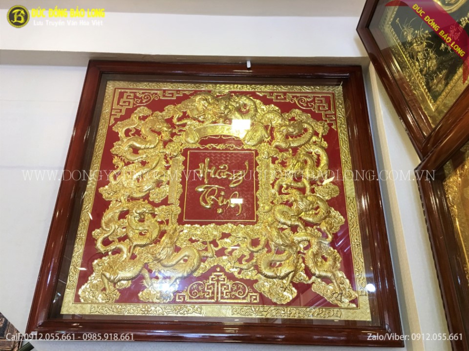 Tranh cửu long hưng thịnh được các nghệ nhân của Bảo Long chạm hoàn toàn bằng phương pháp thủ công bằng tay từ nguyên liệu đồng vàng nhập khẩu Hàn Quốc. Tranh được thiết kế khung gỗ cao cấp, mặt kính dày 4ly. Tranh Cửu long quần tụ quanh chữ Hưng Thịnh viết kiểu thư pháp, hội tụ đủ sinh khí mang lại may mắn, thuận lợi, sức mạnh cho gia chủ. Tranh Cửu Long mạ vàng 24k treo phòng khách sang trọng, đẳng cấp. Đặc biệt thích hợp treo sảnh công ty, phòng làm việc, phòng lãnh đạo… giúp công việc hanh thông, tốt cho việc thăng quan tiến chức, phát triển công việc….