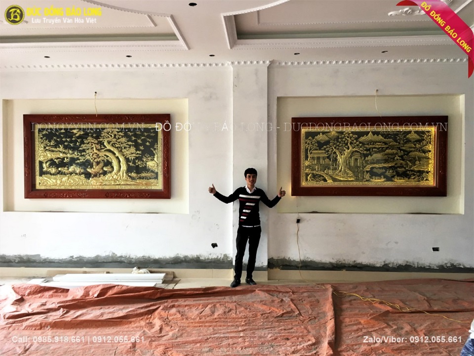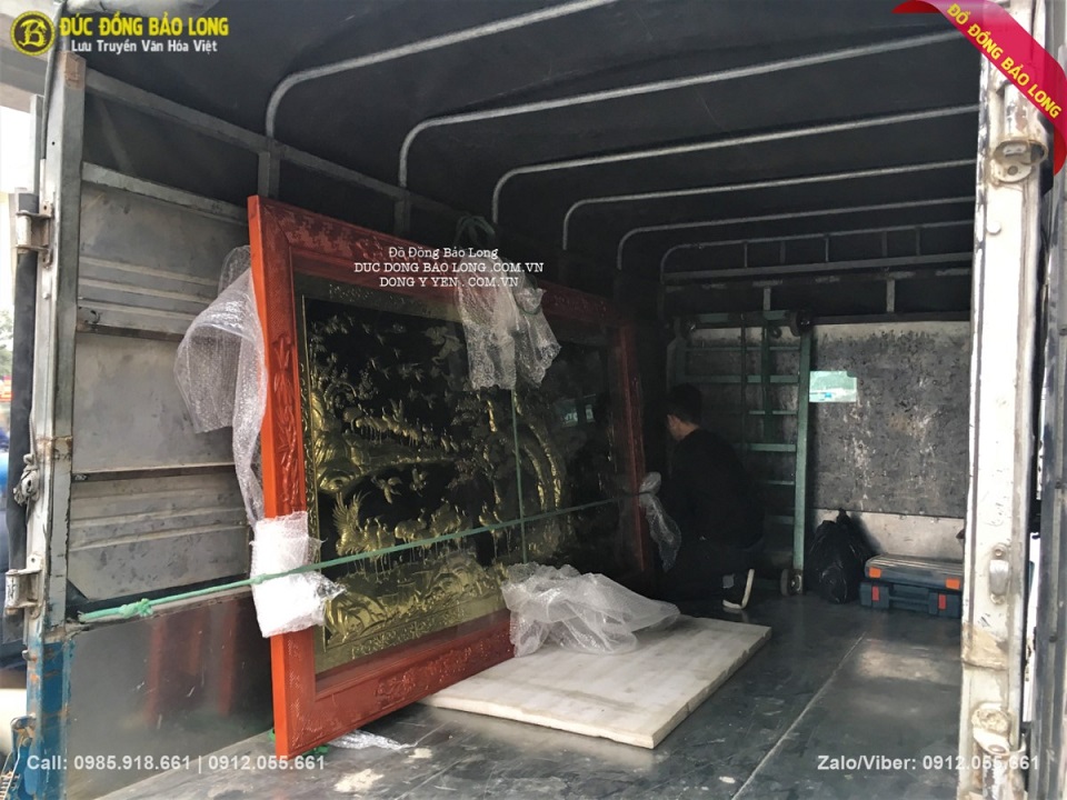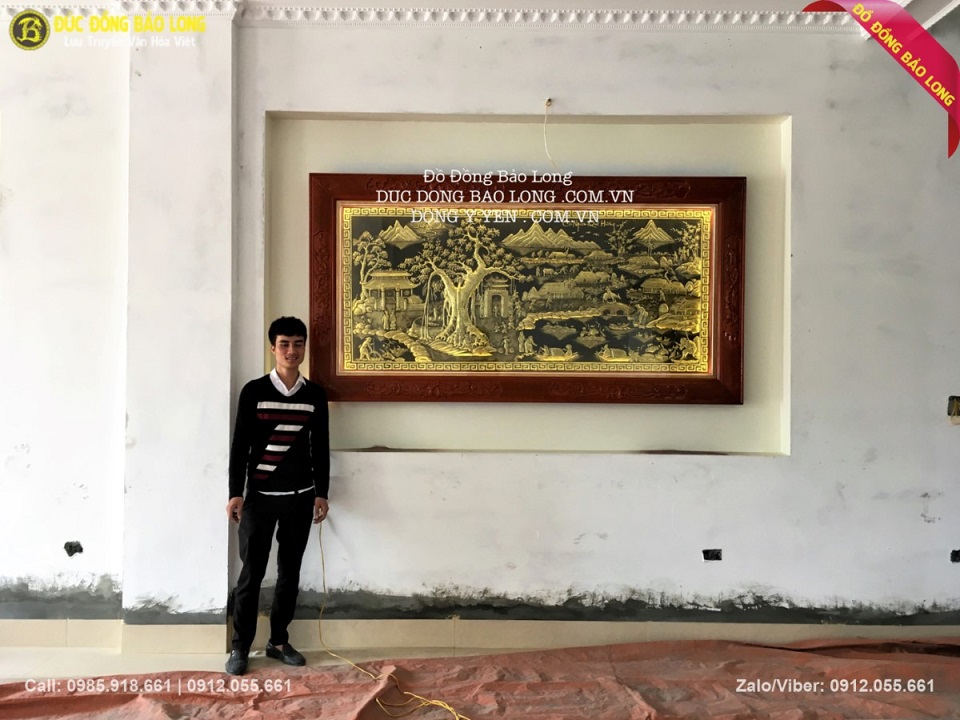 Tranh có kích thước tổng thể là dài 2m31 cao 1m2, khung gỗ trò đục tứ quý tỉ mẩn, lòng tranh toàn bộ bằng đồng dày 8rem, nhập hàn quốc, chạm tay thủ công tinh xảo đẹp mắt. Lòng tranh được hạ màu nâu giả cổ kết hợp đèn led hắt sáng giúp bức tranh lung linh huyền ảo hơn.