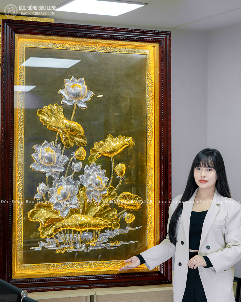 Bức tranh Hoa Sen dát vàng dát bạc với kích thước lớn này là sự kết hợp hoàn hảo giữa vẻ đẹp tinh tế của nghệ thuật chạm đồng, sự quý giá của vàng và bạc, cùng với ý nghĩa phong thủy sâu sắc.