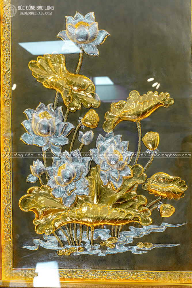 ừng chi tiết như cánh hoa, gân lá, thân sen đều được nghệ nhân thúc nổi thủ công (có độ nổi từ 1-3cm), tạo chiều sâu và độ chân thực. Nét thúc khỏe khoắn, sắc nét nhưng vẫn giữ được sự mềm mại, uyển chuyển của hoa sen. Những bông sen nở rộ được dát bạc, làm nổi bật sự thanh khiết và cao quý, đối lập một cách duyên dáng với các chi tiết mạ vàng xung quanh. Lá sen lớn, tán rộng thường được dát vàng, thể hiện sự che chở, bao bọc và thu hút năng lượng tốt.