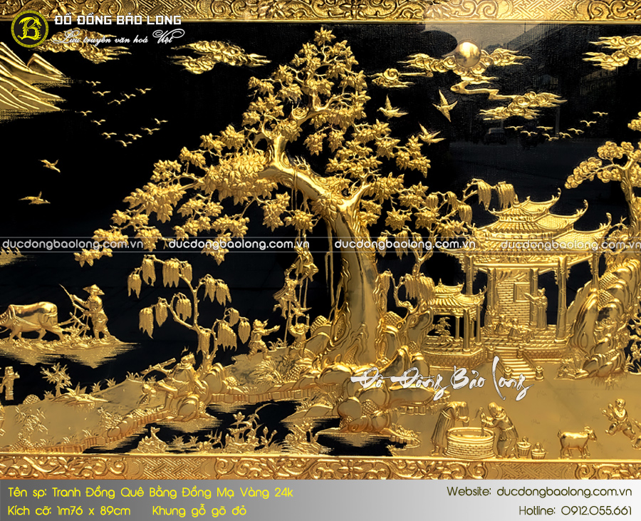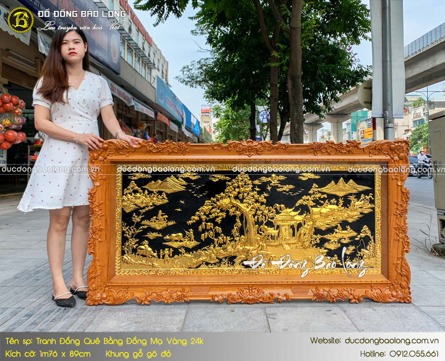 Tranh Đồng Quê bằng đồng mạ vàng 1m76 x 89cm được gò chạm thủ công hoàn toàn bằng tay. Bức tranh có chất lượng hoàn thiện tốt, tổng thể cân đối, từng chi tiết được đưa vào vô cùng sinh động, bắt mắt. Bề mặt tranh phủ vàng ròng điểm xuyến hoa văn vô cùng đẳng cấp.