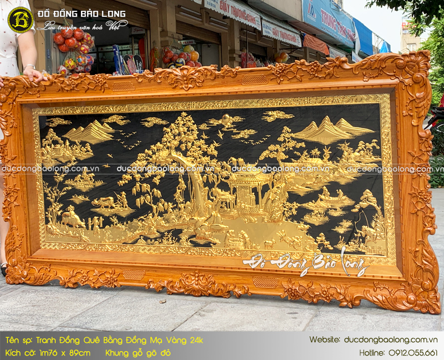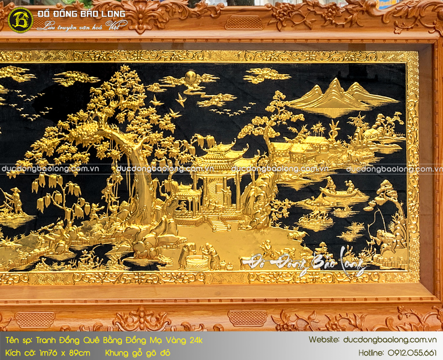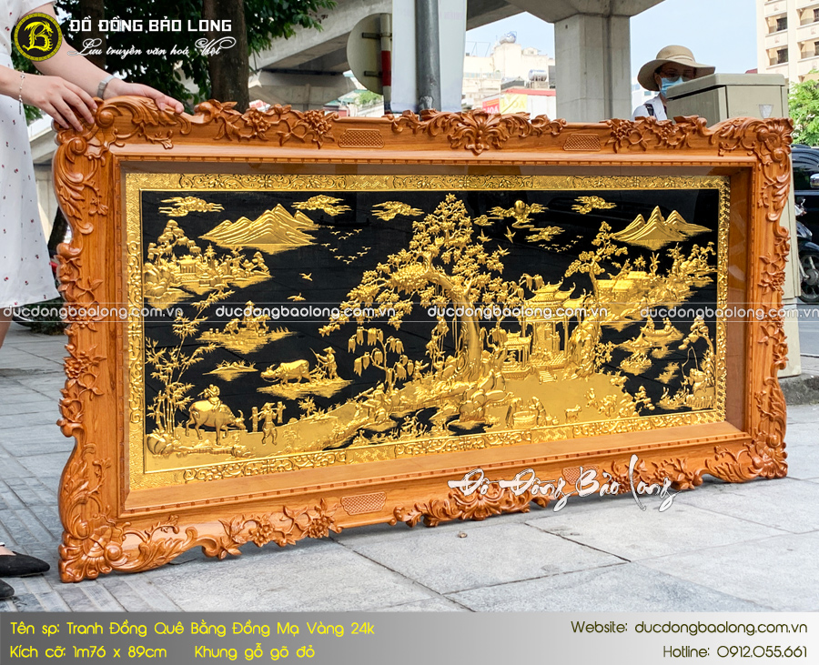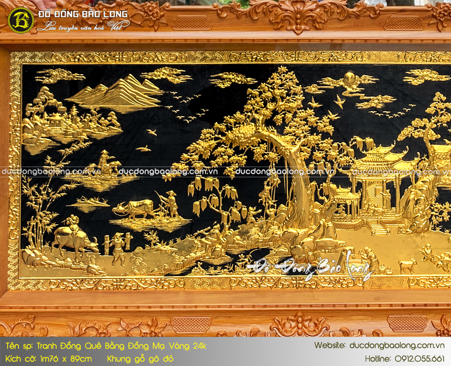 Mẫu tranh đồng quê bằng đồng mạ vàng 24k sử dụng khung gỗ gõ đỏ cao cấp, xung quanh chạm ám hoa văn truyền thống nổi bật. Kết hợp cùng với đó, bề mặt tranh được lồng thêm tấm kính dày bên ngoài bảo vệ lòng tranh luôn bền đẹp.