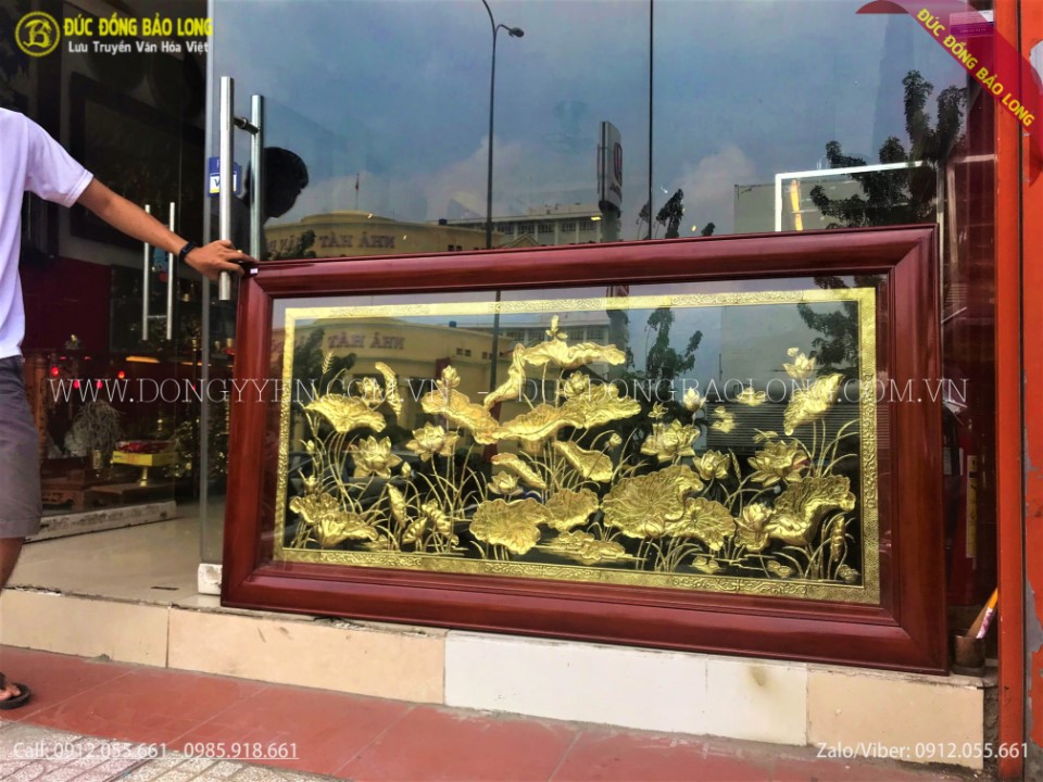 Tranh hoa sen bằng đồng khung 1m70 x 90cm vừa được cơ sở Bảo Long hoàn thiện việc chế tác. Tranh tượng trưng cho vẻ đẹp thanh cao, tinh khiết của tâm hồn, thể hiện sự no đủ, sự cố gắng vượt qua sự đen tối, tranh hoa sen thích hợp treo hầu hết tại tất cả các không gian.