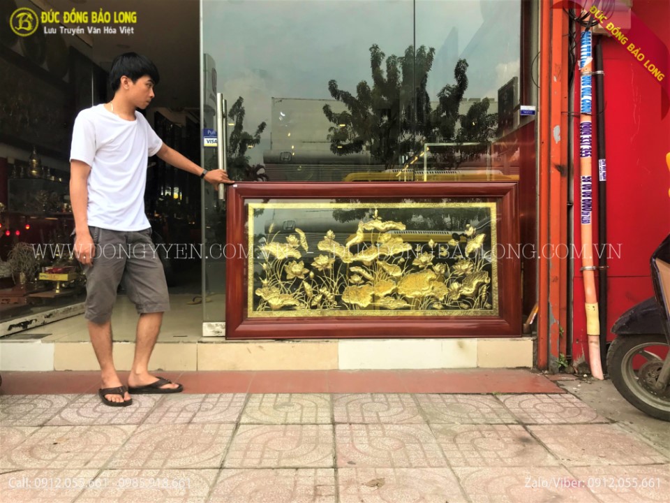 Tranh hoa sen bằng đồng này có kích thước là 1m70 x 90cm. Ngoài ra, Bảo Long còn nhiều kích thước khác để quý khách lựa chọn phù hợp hơn với mọi không gian.