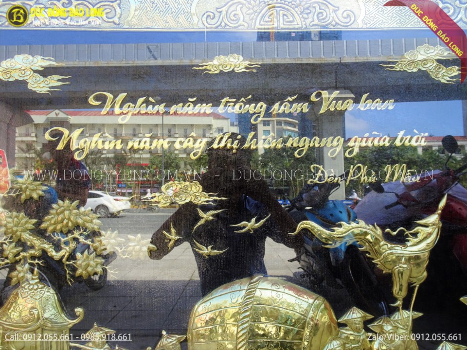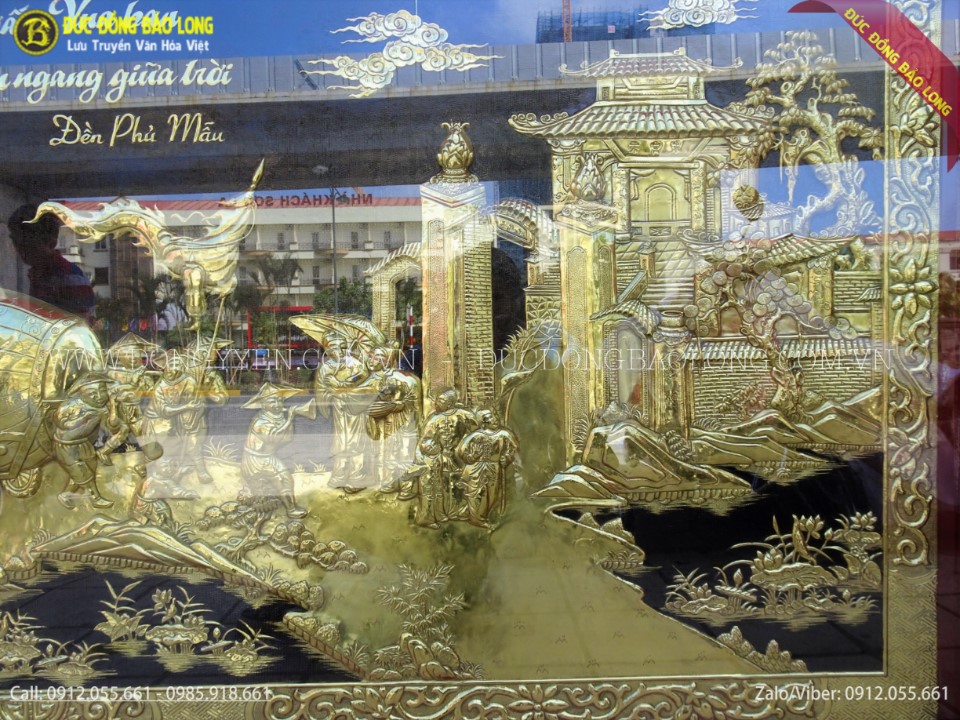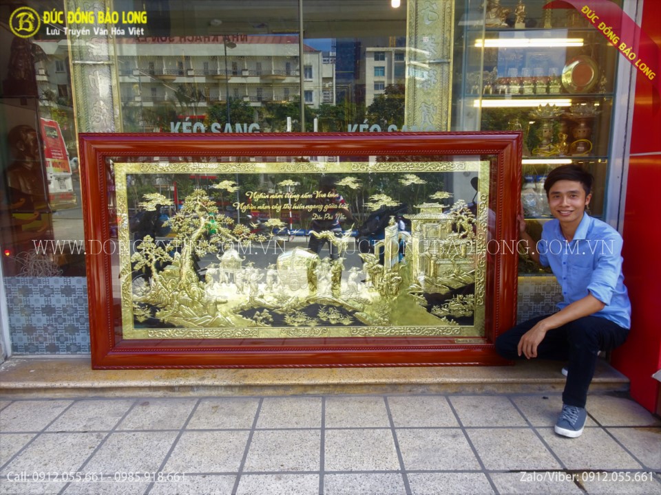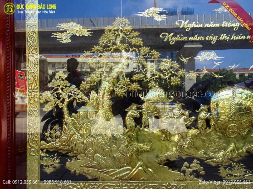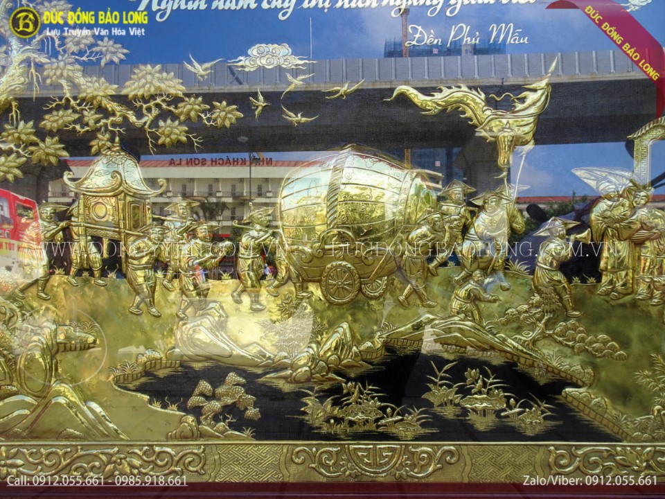 Tranh hội làng rước trống bằng đồng khổ 2m31 thể hiện nội dung đoàn người rước quả trống lớn lấy khung ảnh chính làng quê có cây thị to, đình làng. Tranh được các nghệ nhân của Bảo Long chạm tay hoàn toàn thủ công rất tỉ mỉ tâm huyết nên tinh xảo, sắc nét đến từng chi tiết nhỏ. Nguyên liệu đồng vàng nguyên tấm nhập khẩu tại Hàn Quốc, đồng dày 8rem, khung gỗ tuyển trọn đẹp không tỳ vết. Tranh được chế tác theo yêu cầu của vị khách hàng tại Bắc Ninh.