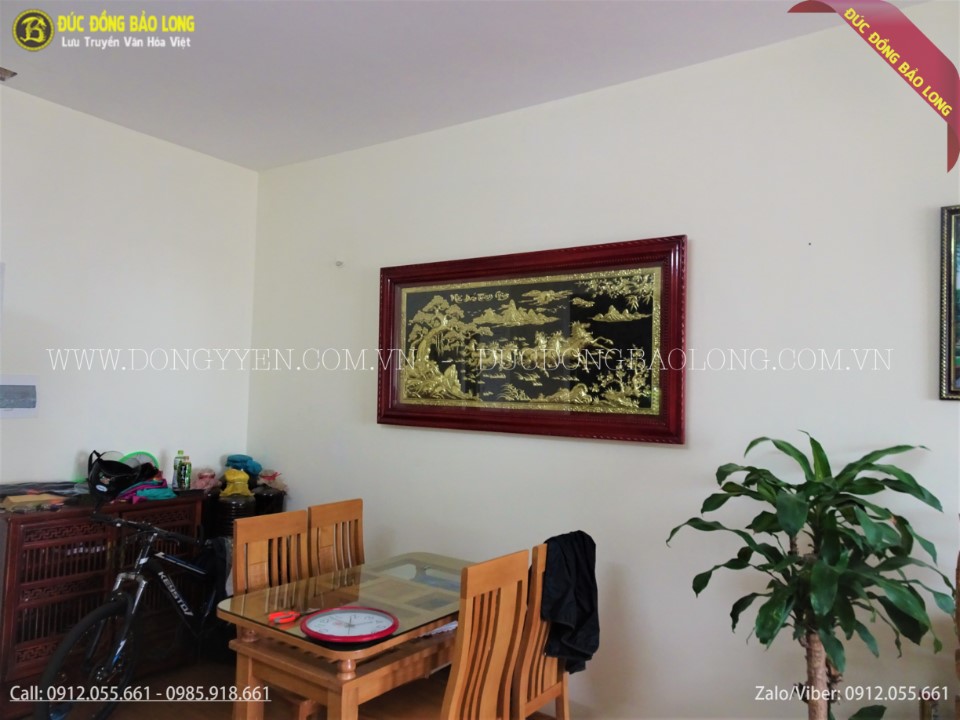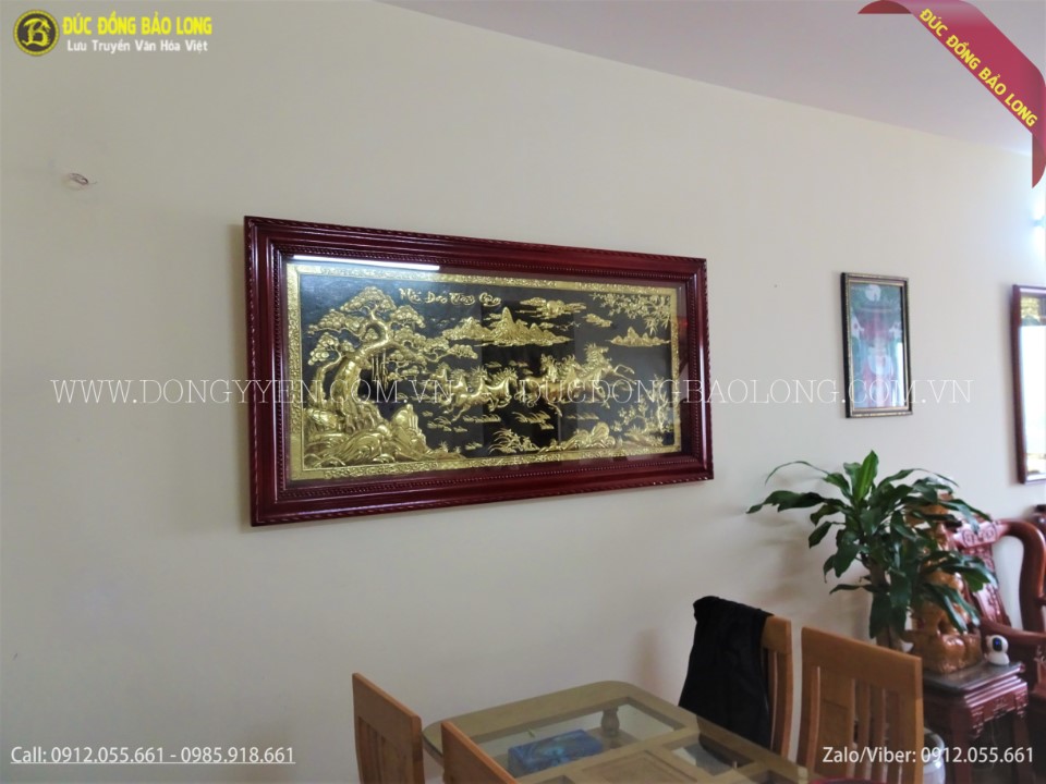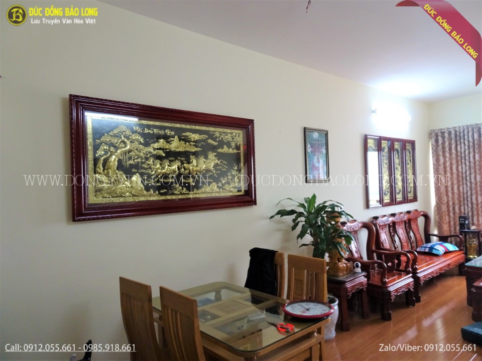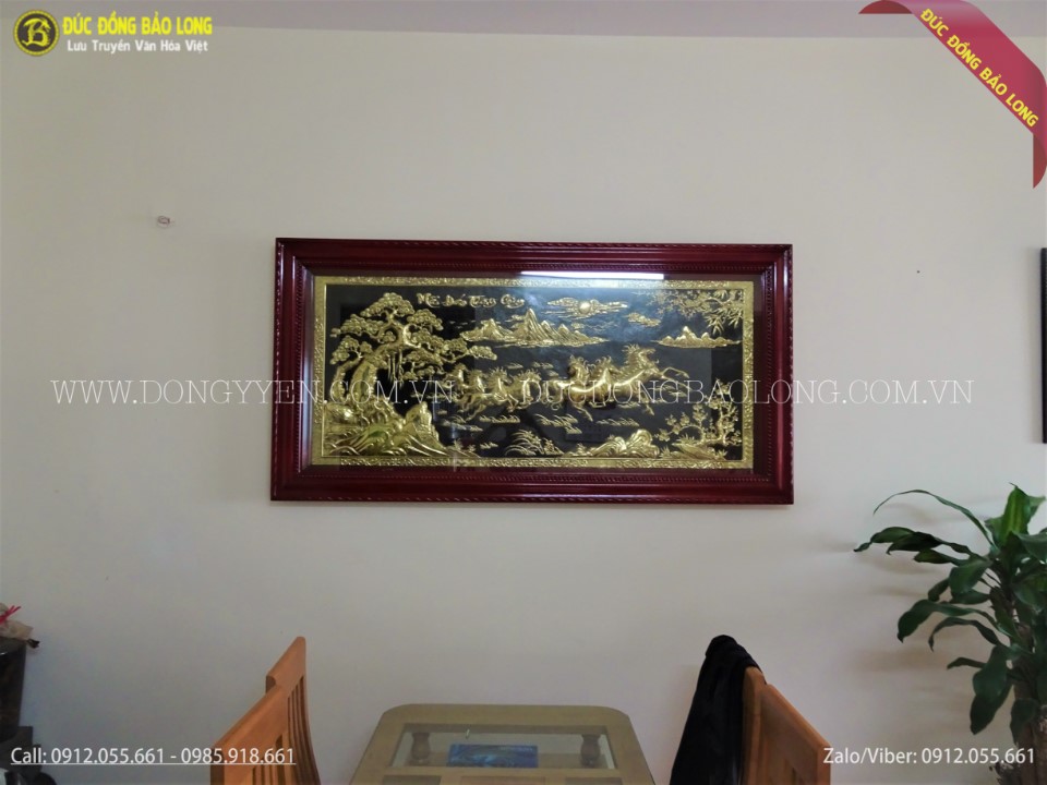 Tranh mã đáo thành công bằng đồng cho khách ở Hà Đông được chế tác hoàn toàn thủ công từ đồng vàng nguyên tấm nhập khẩu Hàn Quốc, đồng dày 8rem, khung tranh là loại gỗ gụ cao cấp đã được xử lý rất chắc chắn đảm bảo không bị nứt nẻ. Bên ngoài được lắp kính dày 4ly để bảo vệ mặt tranh tránh sự và chạm bên ngoài như gió, tác động của các đồ vật xung quanh. Tranh được lắp đặt tại 1 căn hộ chung cư có phòng khách rộng khoảng 30m2 tại CC viện 103, KĐT Văn Quán - Hà Đông.