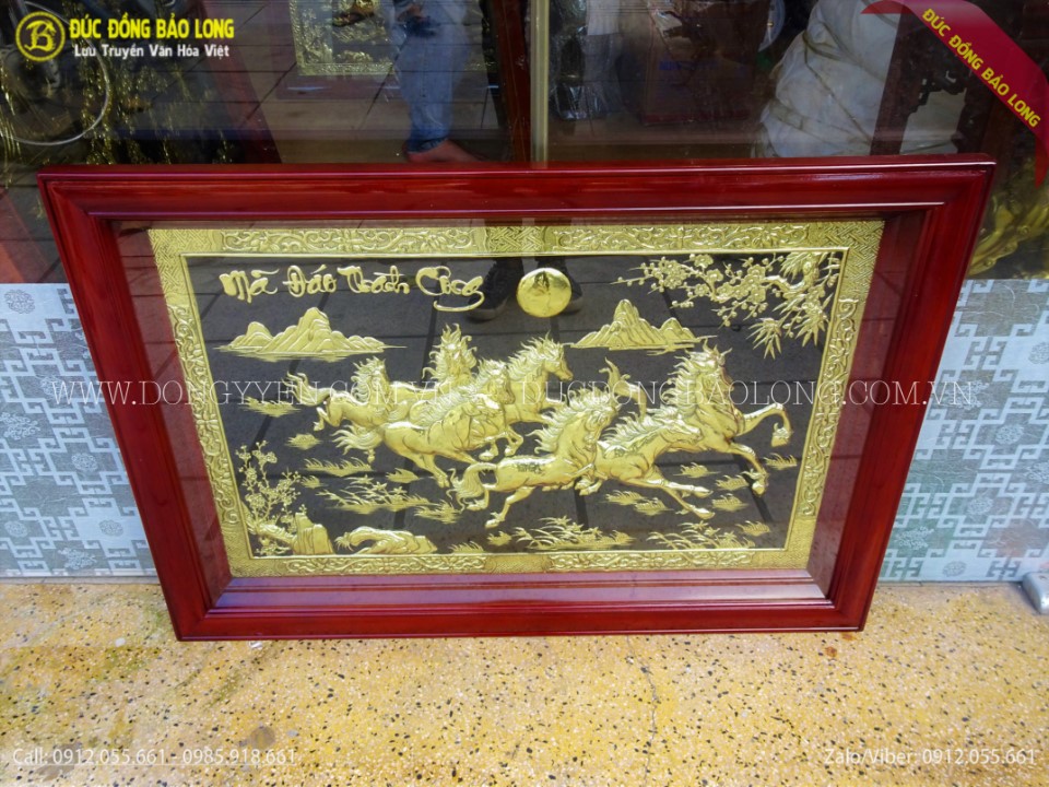 Đúc Đồng Bảo Long vừa hoàn thiện tranh mã đáo thành công bằng đồng khổ 88x61cm để phục vụ những khách hàng có sở thích chơi tranh đồng nhưng không gian thì chật hẹp. Tranh mã đáo thành công khổ nhỏ vẫn đáp ứng đầy đủ các tiêu chí từ mẫu mã, nguyên liệu đảm bảo sản phẩm chất lượng, đẹp như mọi loại tranh khác. Tranh được chế tác hoàn toàn thủ công từ nguyên liệu đồng vàng nhập khẩu Hàn Quốc, đồng dày 8rem, khung gỗ gụ cao cấp rất chắc chắn. Sản phẩm được chạm rất tỉ mỉ, sắc nét đến từng chi tiết nhỏ.