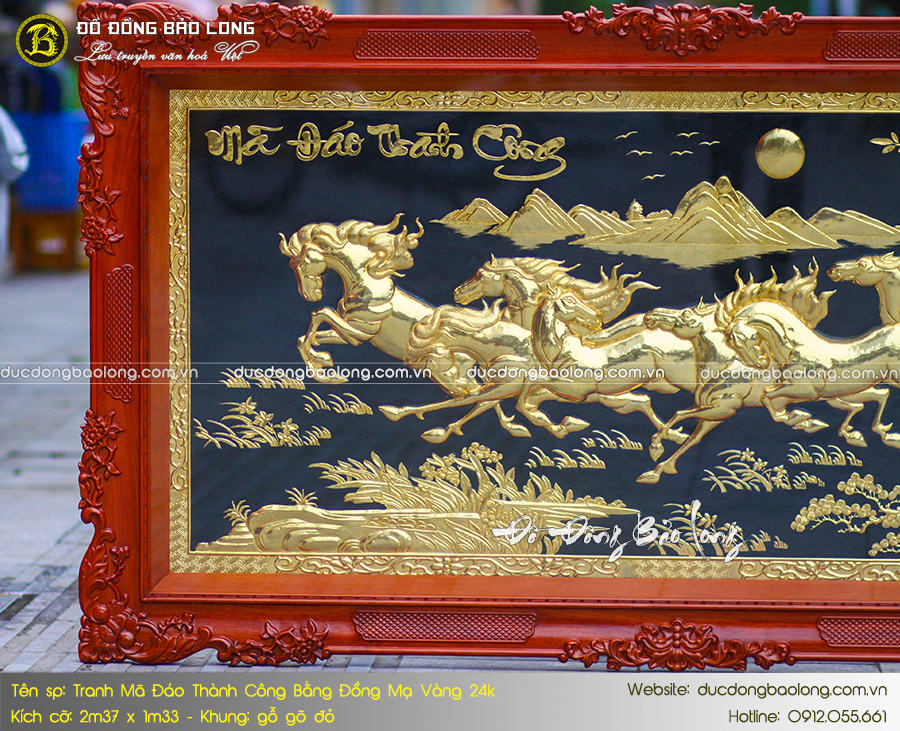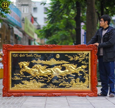 Tranh Mã Đáo Thành Công bằng đồng mạ vàng 24k kích thước 2m37 x 1m33 có kích thước lớn, phù hợp trưng bày trong những không gian rộng như phòng khách, phòng làm việc, đại sảnh công ty. Bức tranh mang vẻ đẹp hội họa, thể hiện kỹ thuật gò chạm hoa văn đỉnh cao của người nghệ nhân. Từng đường nét được thúc, gò trai chuốt, tỉ mỉ, độ nông sâu hài hòa, tạo nên một tổng thể cân đối với hình tượng ngựa, cỏ cây hoa lá được thổi hồn sinh động.