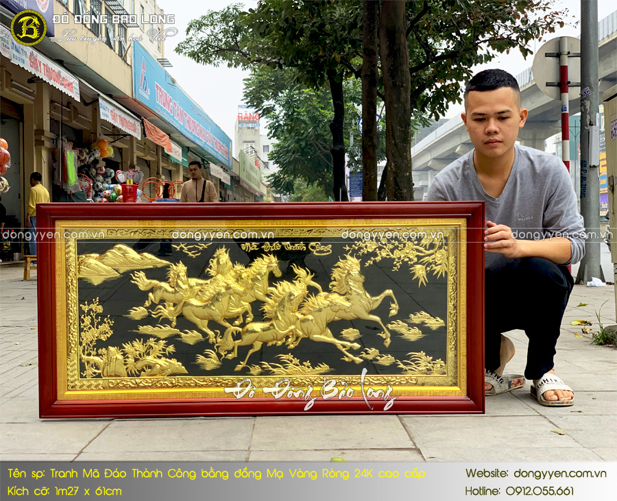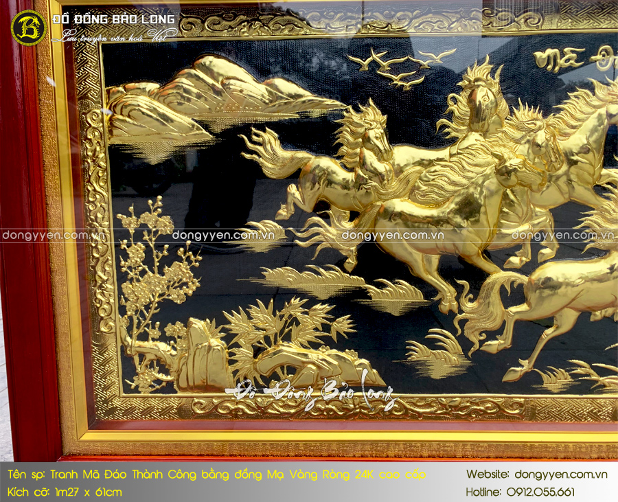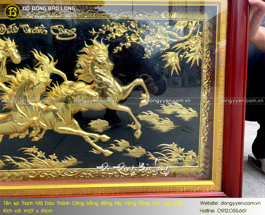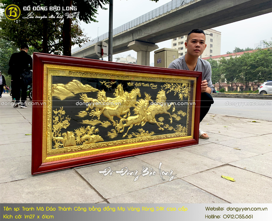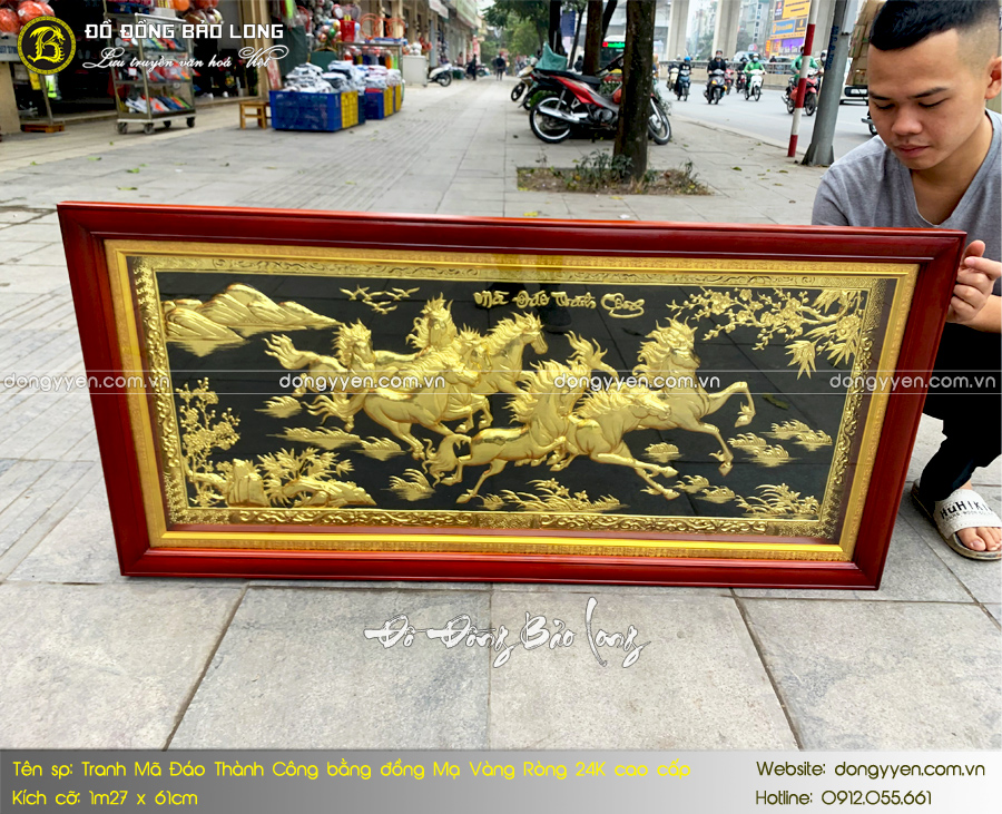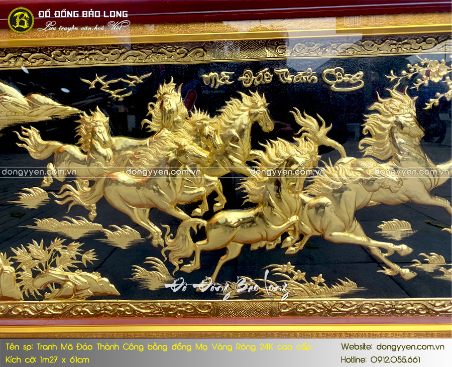 Tranh Mã Đáo Thành Công mạ vàng 24k 1m27 khung chò chỉ có vẻ ngoài độc đáo, ý nghĩa. Bức tranh được chạm thủ công từ tấm đồng nguyên nhập khẩu Hàn Quốc. Tranh Bát Mã có phong thủy tốt nhất, được rất nhiều người ưa chuộng treo trong nhà hay phòng làm việc.