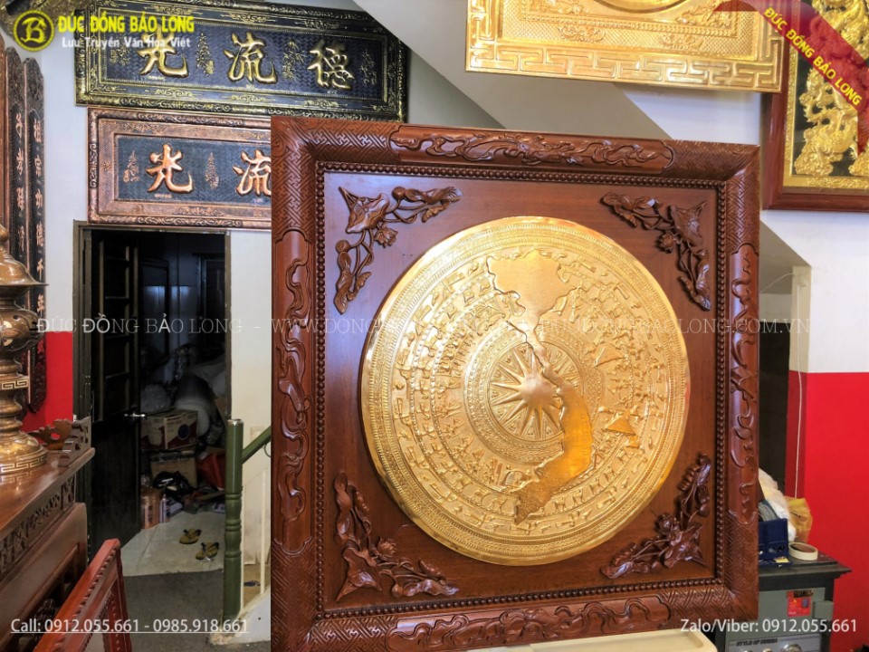 Đây là mẫu tranh mặt trống đồng cao cấp được các nghệ nhân của Bảo Long chạm dựa theo mẫu chuẩn mặt trống đồng Đông Sơn cổ và cải tiến thêm hình bản đồ Việt Nam giúp sản phẩm thêm phần độc đáo mang đạm bản sắc Việt. Sản phẩm được chế tác hoàn toàn thủ công từ nguyên liệu đồng vàng nguyên tấm nhập khẩu tại Hàn Quốc. Khung tranh là loại gỗ hương được tuyển trọn, khổ vuông 1m07 chuẩn theo thước loban, phía sau có thiết kế móc treo rất chắc chắn. Tranh được chạm vô cùng tinh xảo, sắc nét, khung chạm những đường công vuông vức. Mặt trống đồng được mạ phủ vàng ròng 24k bằng phương pháp điện phân nhúng bể cao cấp nhất hiện nay.