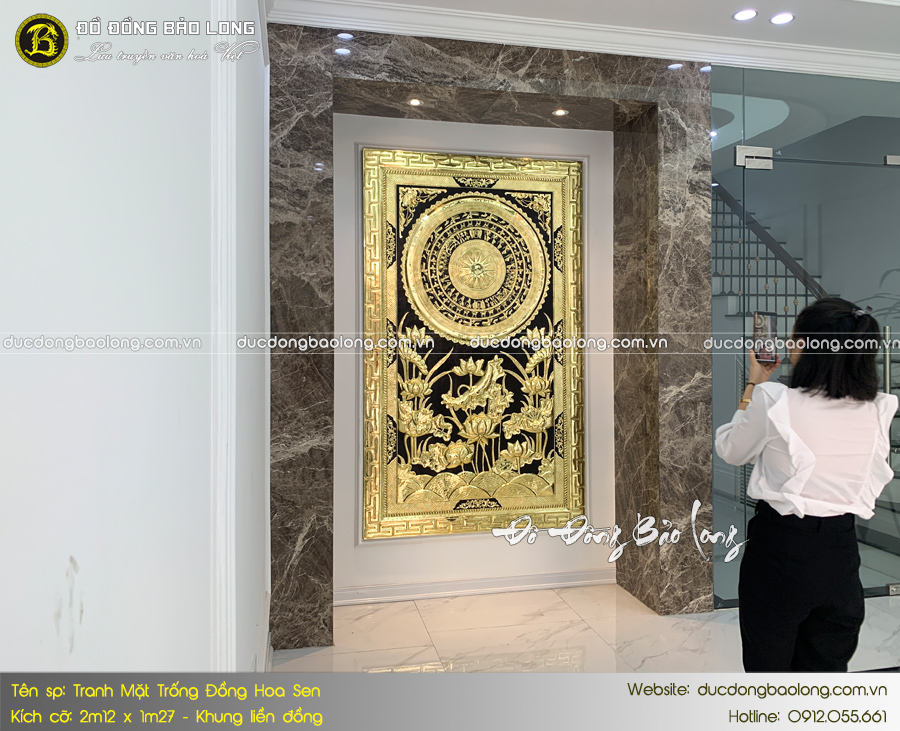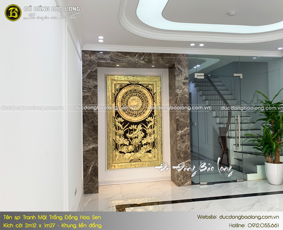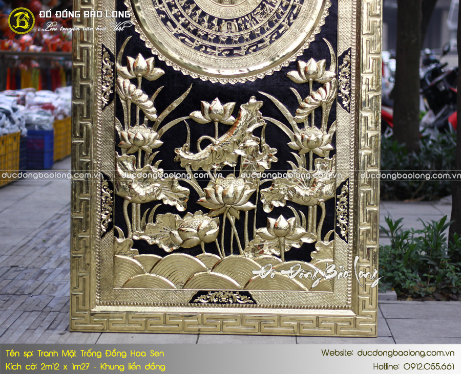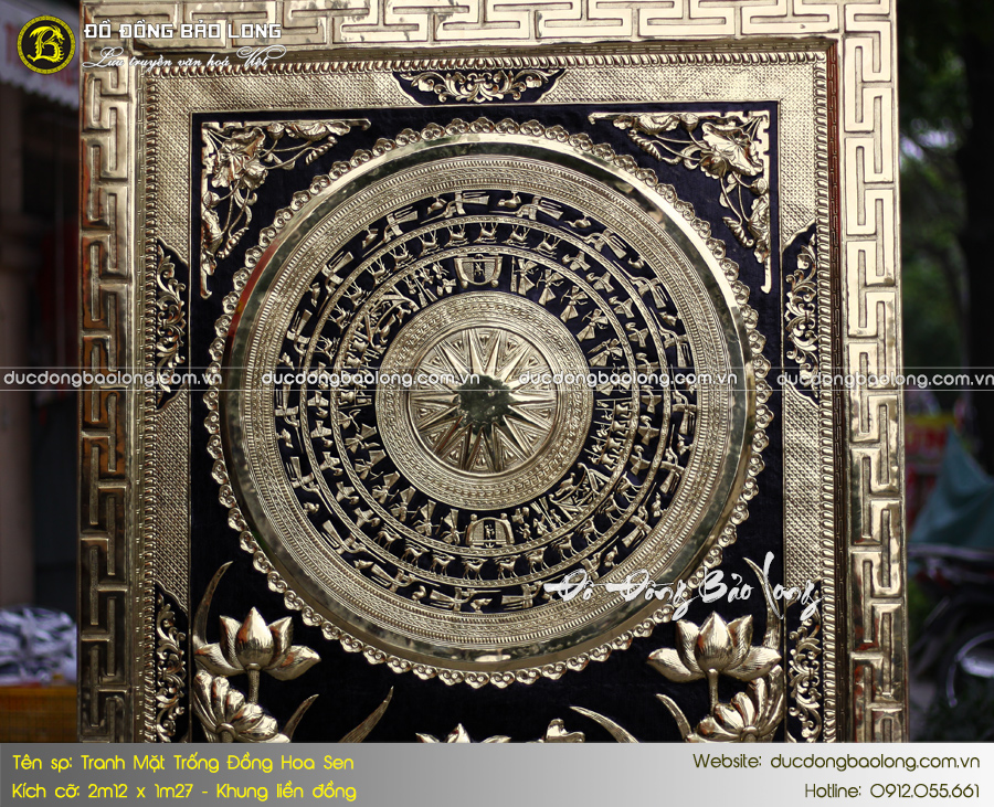 Nổi bật bởi mẫu mã bắt mắt, sang trọng bởi thiết kế tinh xảo, mẫu tranh Mặt Trống Đồng Hoa Sen được nhiều khách hàng yêu thích và lựa chọn để trưng bày tại phòng khách, phòng làm việc, sảnh công ty, tập đoàn... Sản phẩm được thiết kế theo kích thước 2m12 x 1m27 theo yêu cầu của khách hàng, quy trình chế tác gò chạm thủ công hoàn toàn bằng tay.
