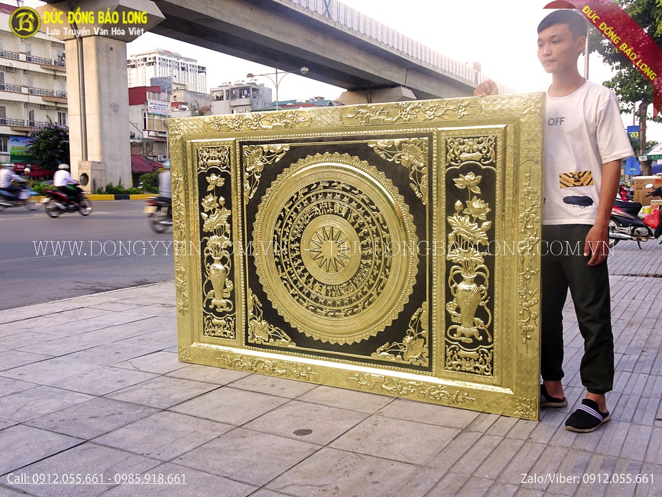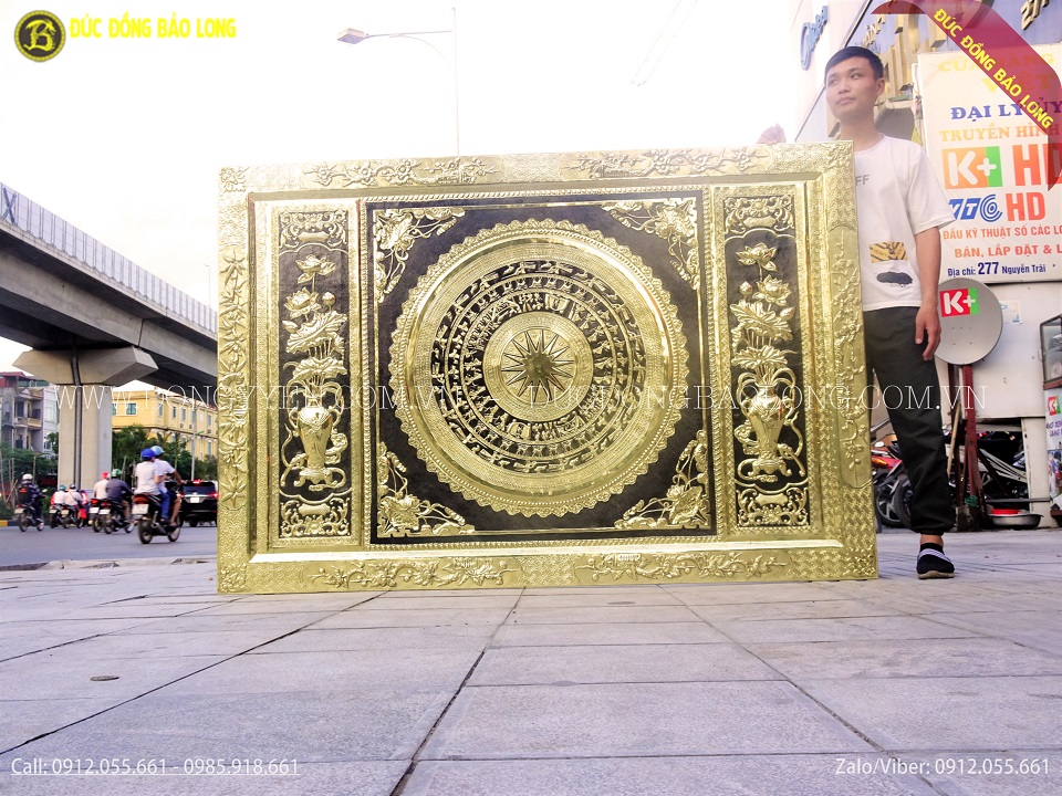 Bảo Long chế tác thành công mẫu tranh mặt trống đồng mới Tranh Mặt Trống Đồng Hoa Sen 2m17 khung đồng. Tranh mặt trống đồng hoa sen thuộc loại hàng chạm tay tinh xảo cao cấp thực hiện trực tiếp bởi nghệ nhân Bảo Long. Tranh sử dụng chất liệu đồng vàng nhập khẩu Hàn Quốc dày 8rem, khung xương bằng inox vô cùng cứng cáp và bền, kích thước dài 2m17 cao 1m55. Lòng tranh chính giữa chạm mặt trống đồng có đường kính chừng 1m, hai bên là 2 lọ hoa sen cách điệu phân tách bằng đường thẳng, bố cục hài hòa đẹp mắt. Hình ảnh mặt trống đồng mang nét văn hóa cổ kết hợp với hoa sen sẽ rất phù hợp cho việc trang trí ở những nơi tôn nghiêm, trang trọng như văn phòng, nhà thờ, phòng thờ, phòng tiếp khách, sảnh cơ quan...