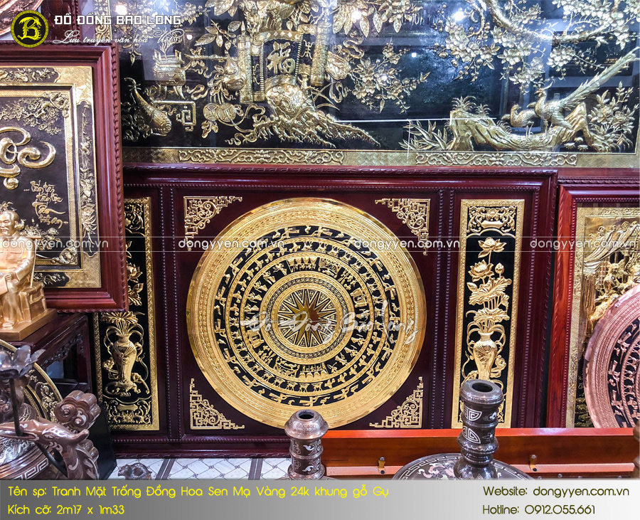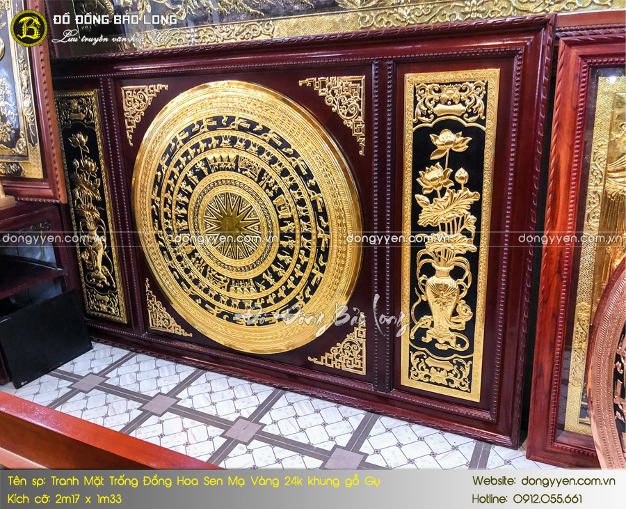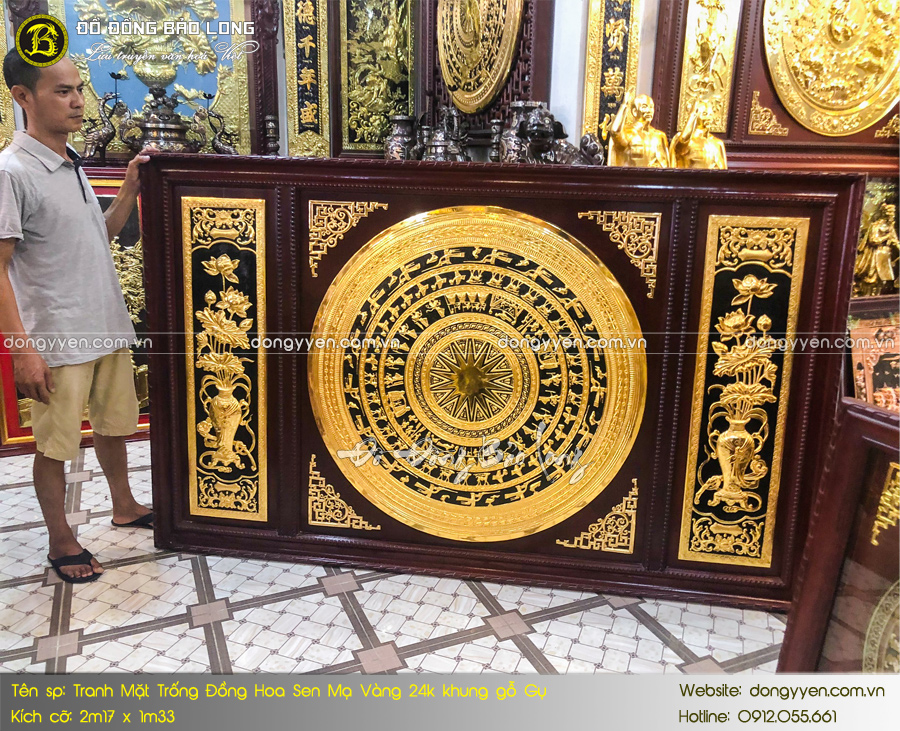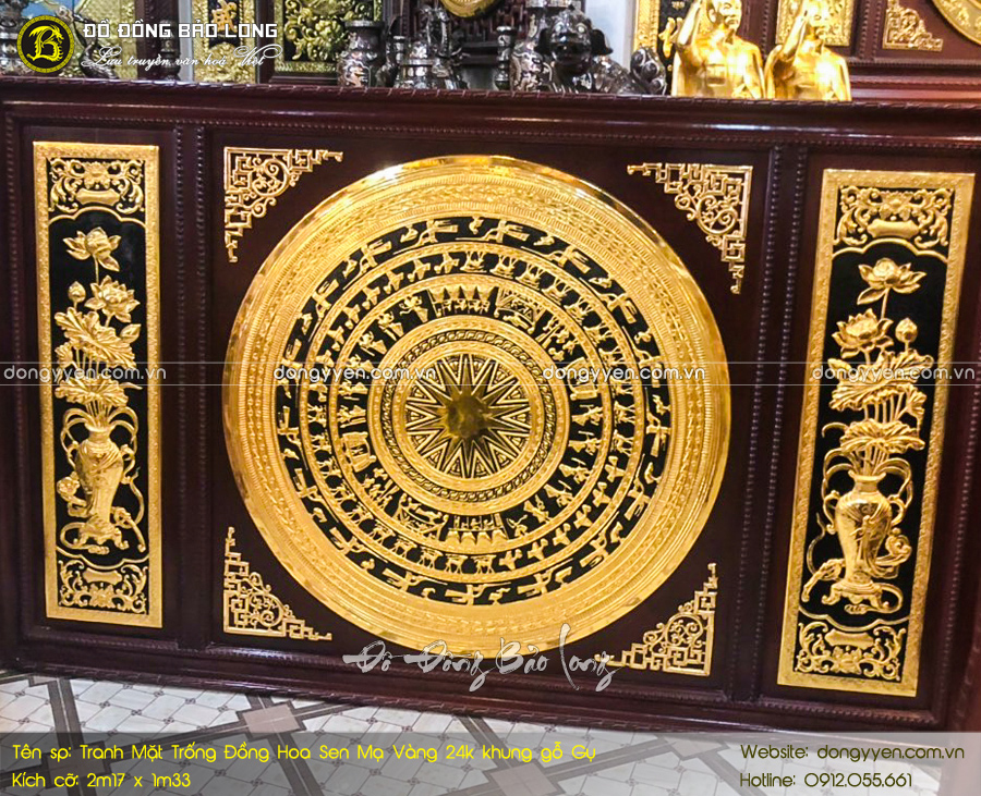 Tranh Mặt trống đồng Hoa sen mạ vàng 24k 2m17 x 1m33 là một trong những sản phẩm chế tác riêng tại Bảo Long. Mẫu sản phẩm có kiểu dáng độc đáo, chế tác thủ công theo phương pháp truyền thống. Các chi tiết hoa văn bằng đồng nổi bật được sắp xếp khéo léo trên nền khung gỗ. Đây là lựa chọn tuyệt vời treo phòng khách, phòng làm việc hay làm quà tặng lãnh đạo, đối tác.