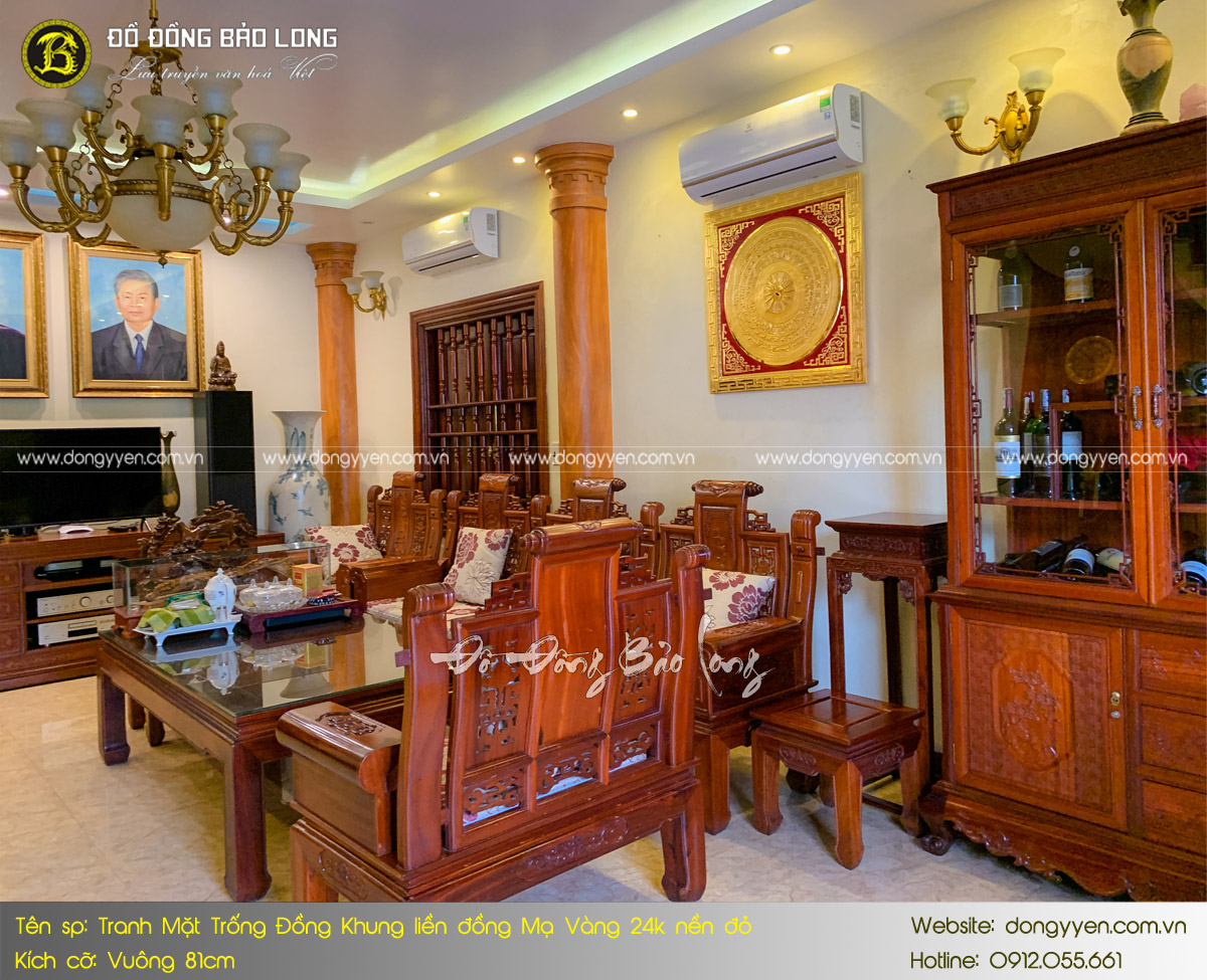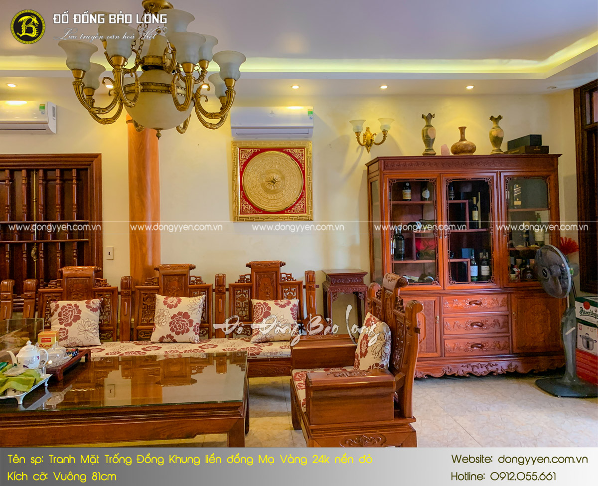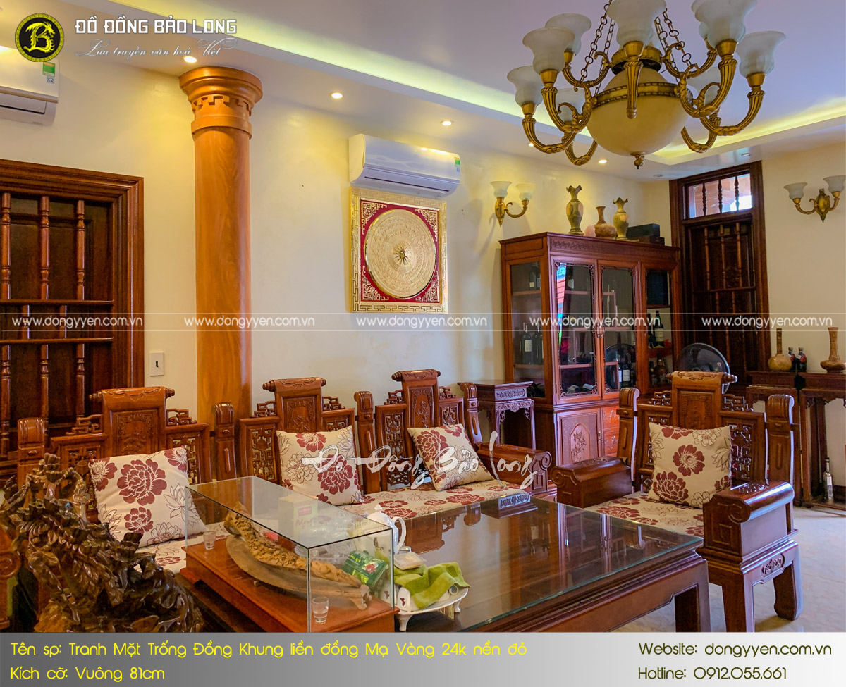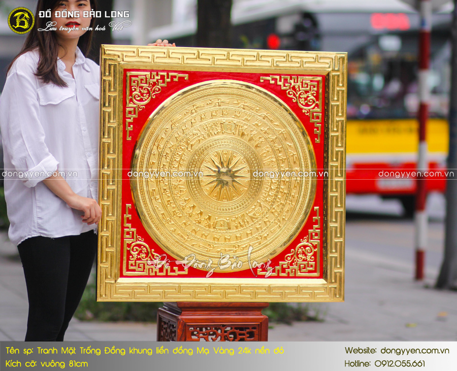 Tranh Mặt trống đồng khung liền đồng mạ vàng 24k khổ vuông 81cm có kiểu dáng độc đáo, màu sắc bắt mắt. Mẫu sản phẩm được nhiều người ưa chuộng bởi giá thành hợp lý, tính thẩm mĩ cao. Ngoài ra, các chi tiết hoa văn được chạm thủ công rất tỉ mỉ, tinh tế. Chất liệu chế tác là đồng nguyên tấm nhập khẩu từ Hàn Quốc chuẩn 8 rem. Các nghệ nhân của Bảo Long tiến hành gò và chạm trên bề mặt tấm đồng nguyên cho tới khi hoàn thành một bức tranh mặt trống hoàn chỉnh như hình ảnh.
