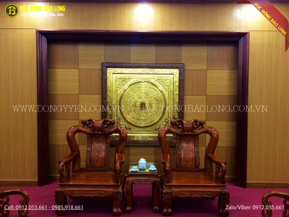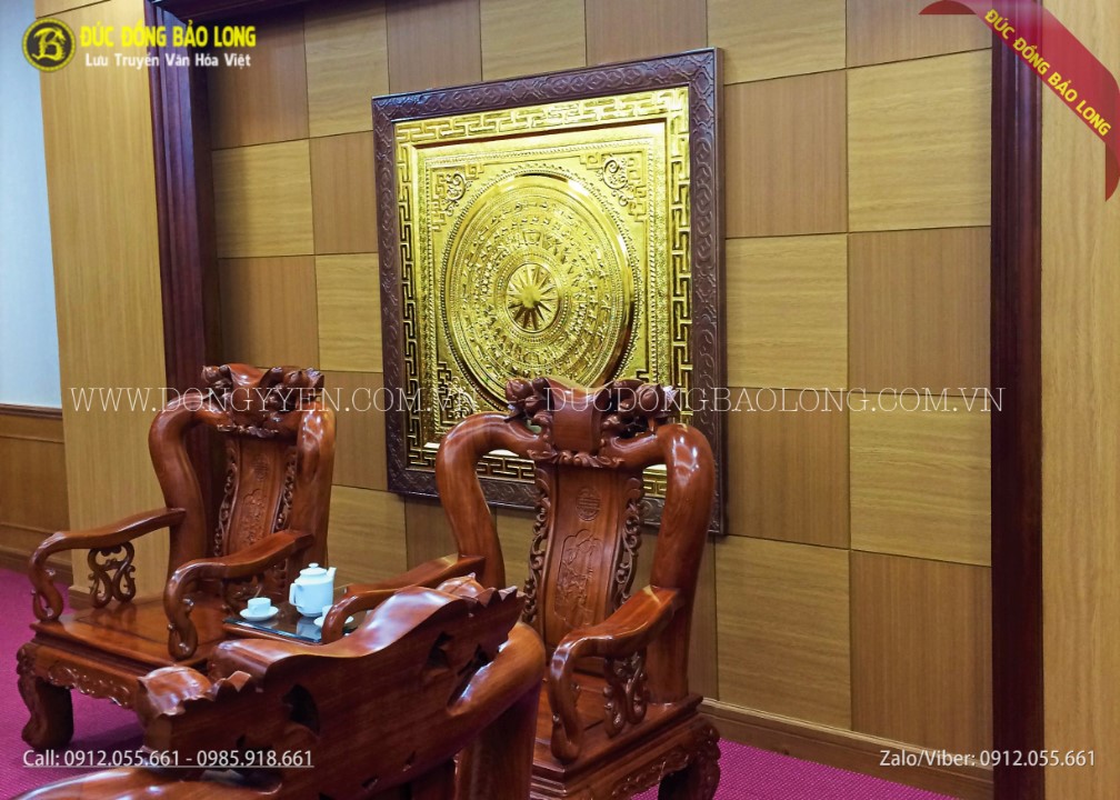 Cơ sở Bảo Long đã hoàn thiện chế tác và lắp đặt tranh mặt trống đồng mạ vàng 24k cho phòng hội nghị tại Ban Chỉ Huy Quân Sự Ba Vì. Tranh mặt trống đồng được chạm hoàn toàn thủ công bằng đồng vàng nguyên tấm nhập khẩu Hàn Quốc, khung liền đồng. Toàn bộ bề mặt sản phẩm được mạ phủ vàng ròng 24k cao cấp nhất hiện nay. Việc kết hợp một sản phẩm bằng kim loại vàng 24k trong không gian nội thất gỗ tạo sự tương đồng phản chiếu hết sức cuốn hút. Tranh mặt trống có kích thước 1m27 hình vuông, phía sau là khung xương inox vững chắc.