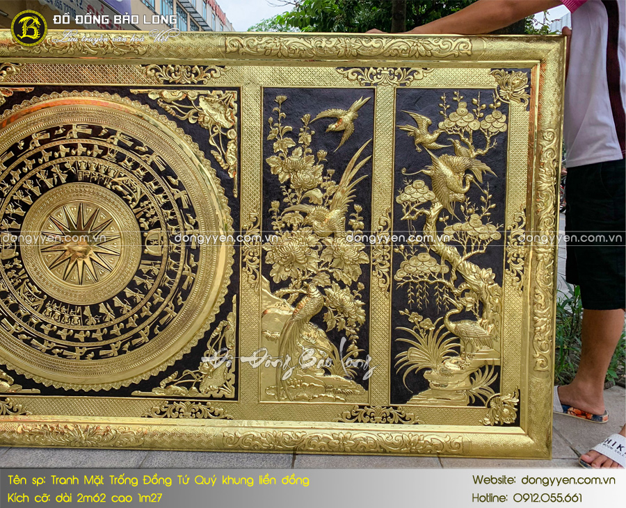 Tranh Mặt trống đồng Tứ Quý khung liền đồng 2m62 x 1m27 là một trong những sản phẩm độc đáo, mới lạ. Mẫu sản phẩm được nhiều người ưa chuộng bởi giá thành hợp lý, tính thẩm mĩ cao. Ngoài ra, các chi tiết hoa văn được chạm thủ công rất tỉ mỉ, tinh tế. Chất liệu chế tác là đồng nguyên tấm nhập khẩu từ Hàn Quốc chuẩn 8 rem. Các nghệ nhân của Bảo Long tiến hành gò và chạm trên bề mặt tấm đồng nguyên cho tới khi hoàn thành một bức tranh mặt trống Tứ Quý hoàn chỉnh như hình ảnh.