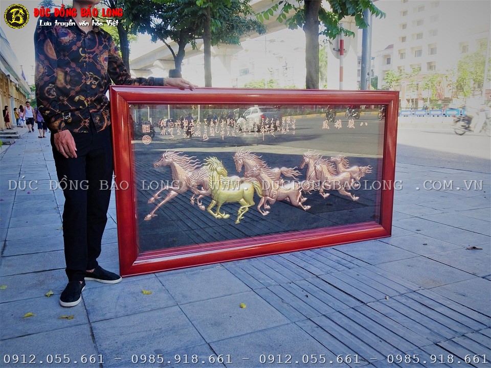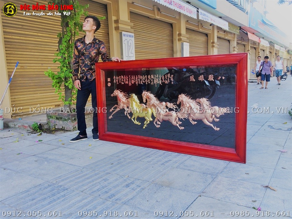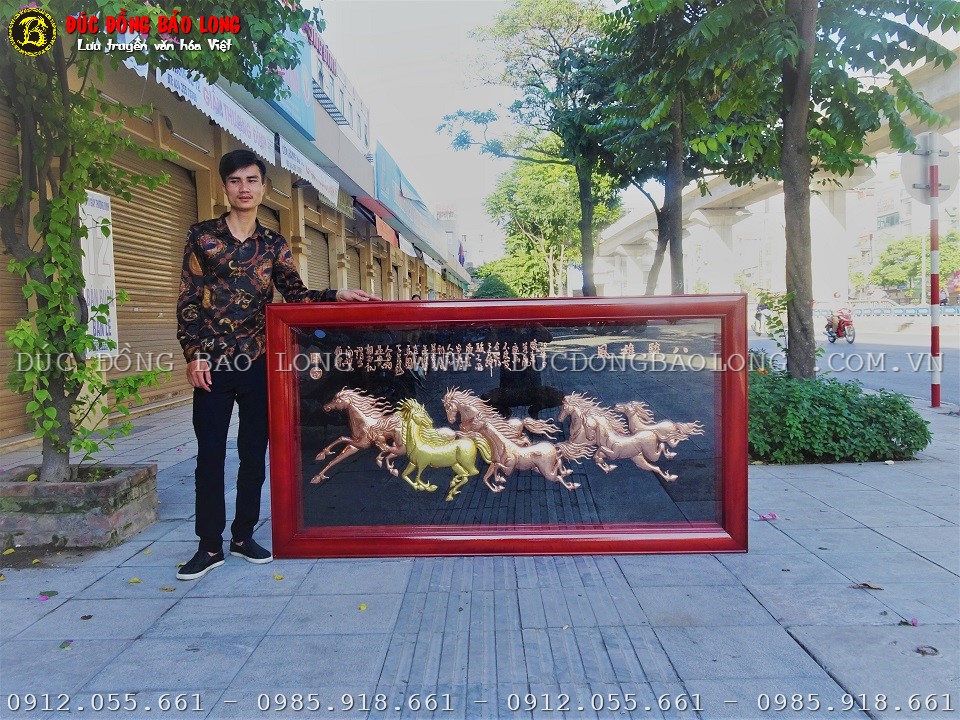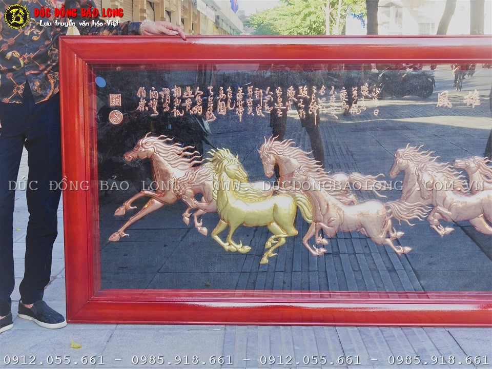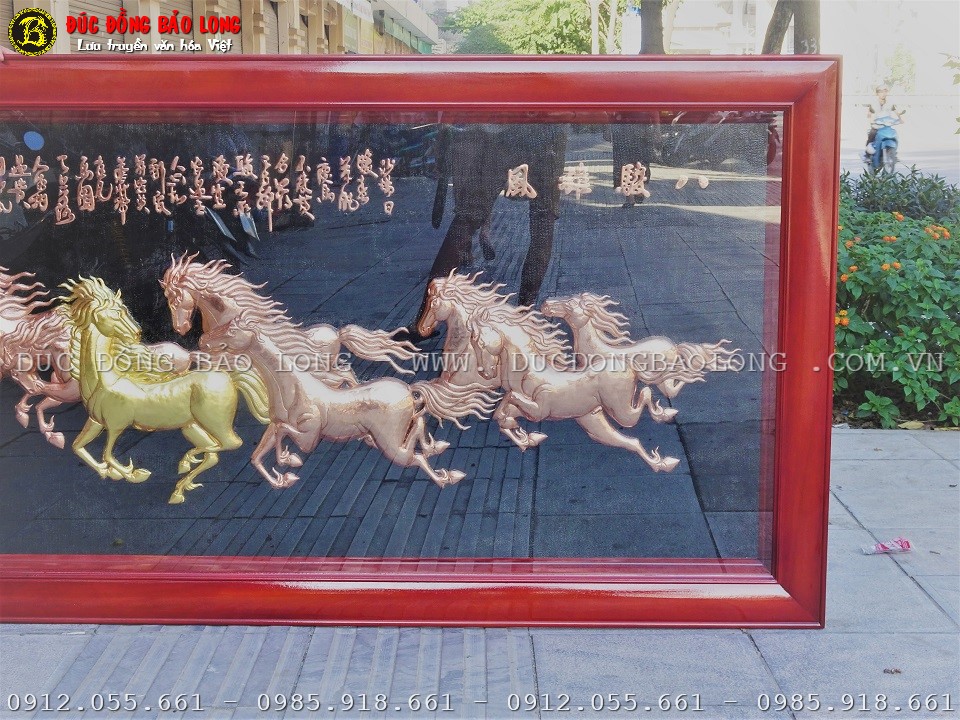 Tranh ngựa được chạm hoàn toàn thủ công từ nguyên liệu đồng đỏ nguyên tấm. Đồng dày 8rem đủ độ dày để tranh không bị méo hay lồi lõm. Khung tranh được làm bằng gỗ gụ rất chắc chắn, bên ngoài được lắp 1 lớp kính dày 4 ly để bảo vệ mặt kính khói bụi bẩn, ẩm mốc bề mặt tranh. Trong bức tranh chạm 8 con ngựa trong đó có 1 con ngựa dát vàng 9999.