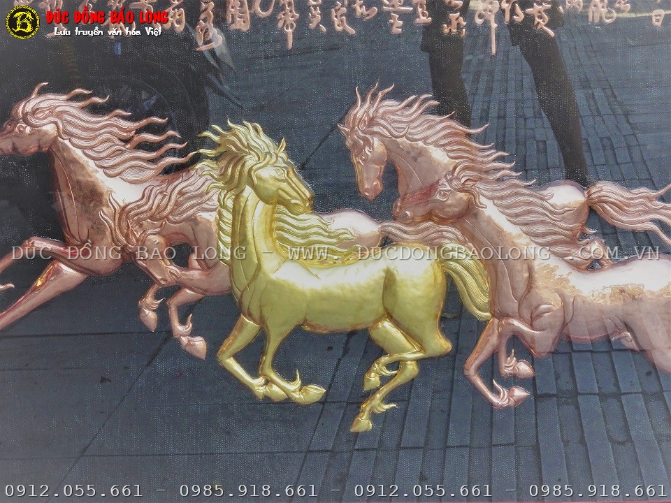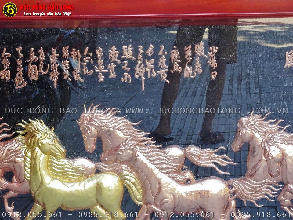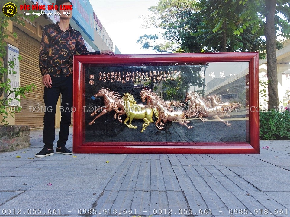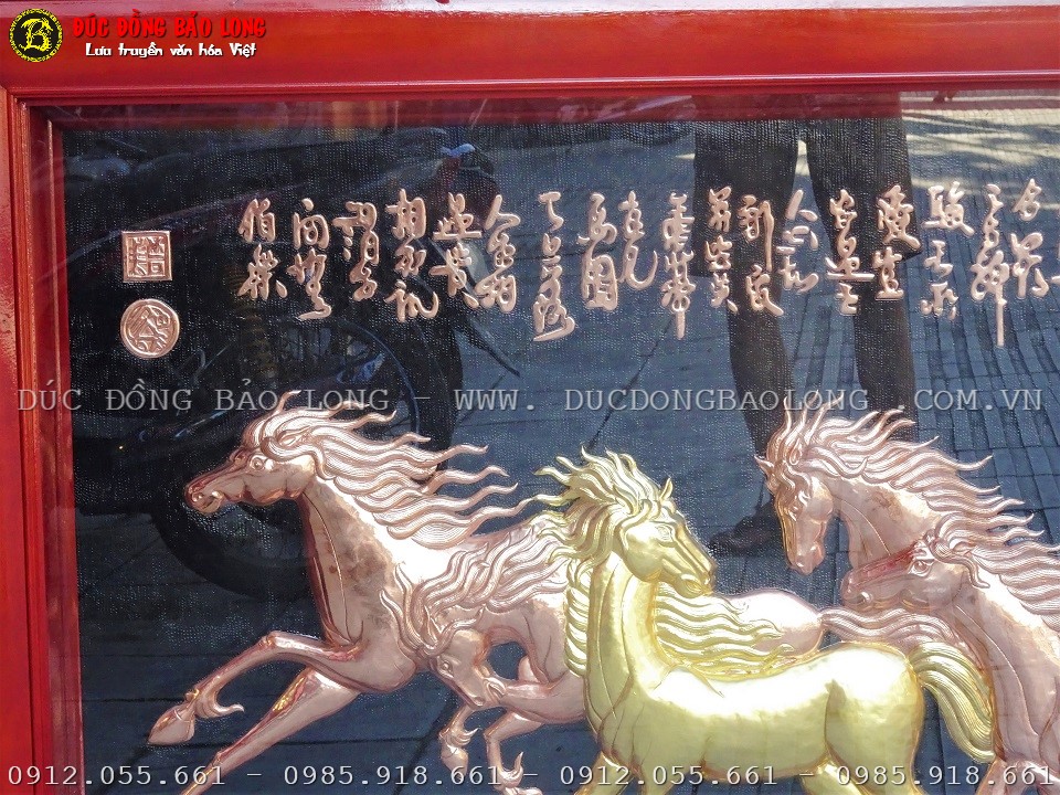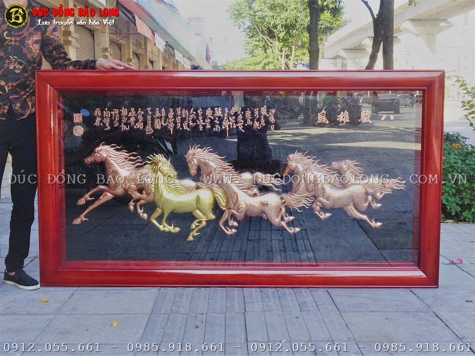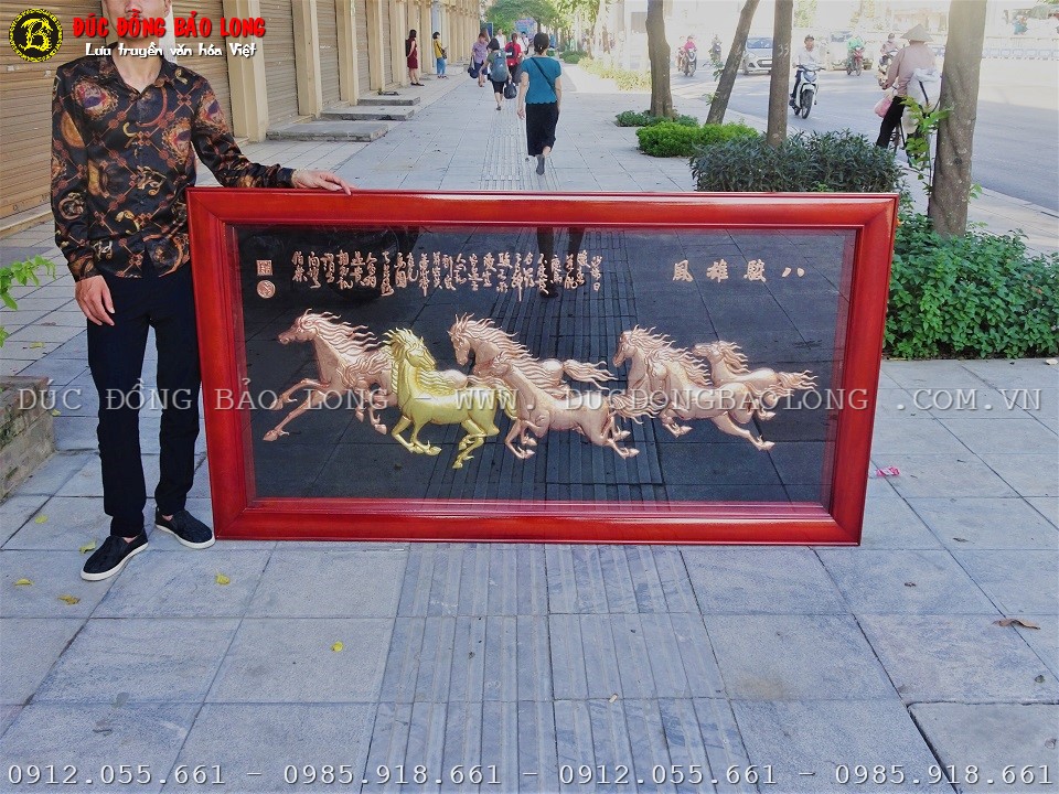 Tranh ngựa được chạm hoàn toàn thủ công từ nguyên liệu đồng đỏ nguyên tấm. Đồng dày 8rem đủ độ dày để tranh không bị méo hay lồi lõm. Khung tranh được làm bằng gỗ gụ rất chắc chắn, bên ngoài được lắp 1 lớp kính dày 4 ly để bảo vệ mặt kính khói bụi bẩn, ẩm mốc bề mặt tranh. Trong bức tranh chạm 8 con ngựa trong đó có 1 con ngựa dát vàng 9999.