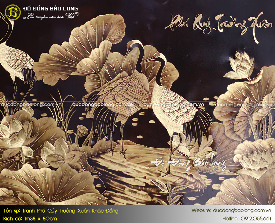 - Bức tranh mang chủ đề phú quý trường xuân khắc họa hình ảnh chim hạc, hoa sen trong đầm lầy, mang ý nghĩa tượng trưng cho sự thanh cao, thuần khiết, sự trường thọ. Ngắm nhìn bức tranh đem đến cảm giác thư thái, an nhiên, xua tan mọi muộn phiền trong cuộc sống.