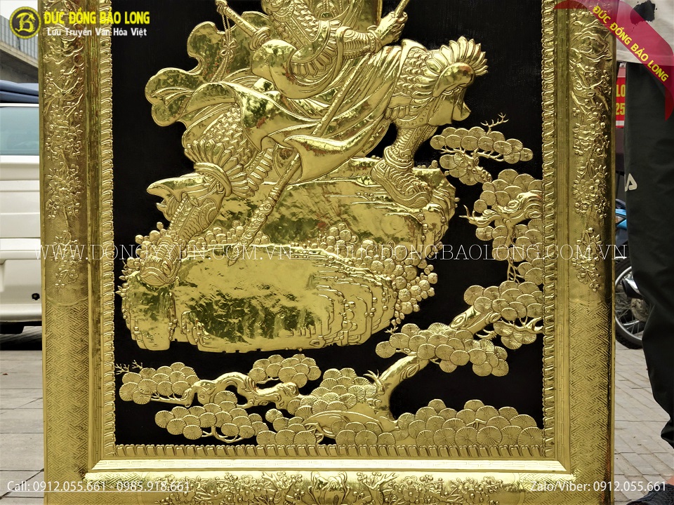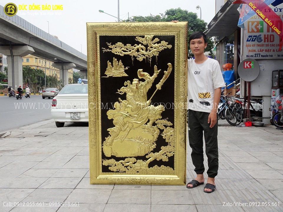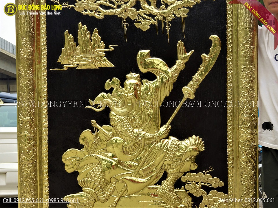 Tranh quan công được chúng tôi chế tác hoàn toàn thủ công từ đồng vàng nhập khẩu Hàn Quốc, đồng dày 8rem, đủ độ dày để tranh không bị méo hay lồi lõm. Tranh được thiết kế theo khổ đứng, khung tranh là loại liền đồng, các hoa văn họa tiết được chạm nổi giữ nguyên màu đồng vàng. Nền tranh được tô màu đen tạo sự nổi bật cho bức tranh.