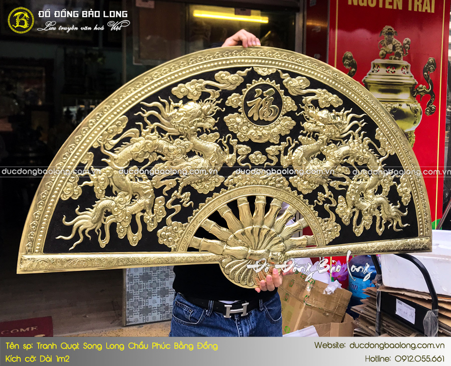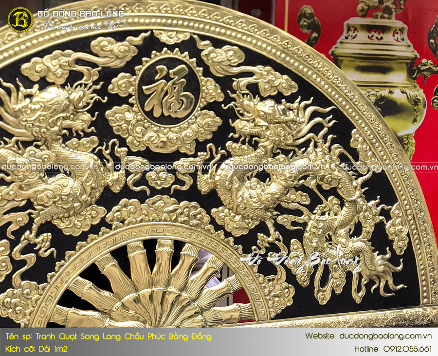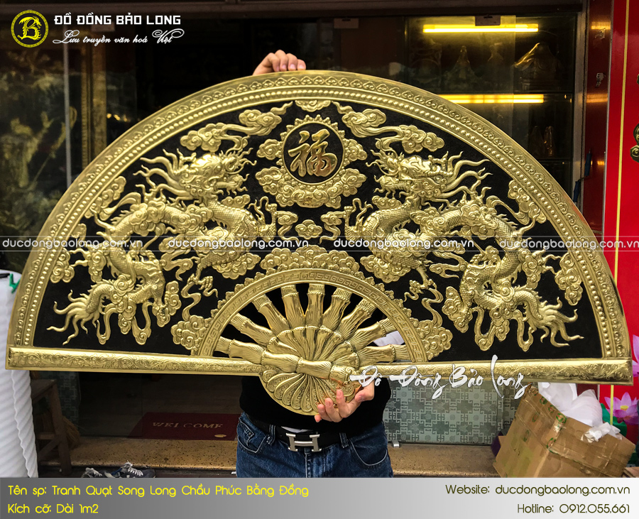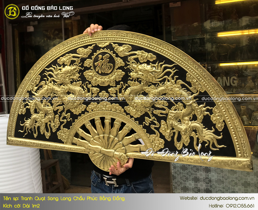 Tranh quạt Song Long Chầu Phúc bằng đồng vàng 1m2 mang màu sắc nền nã, thiết kế tinh xảo, tạo điểm nhấn nổi bật cho không gian trưng bày. Sản phẩm được gò chạm thủ công bởi nghệ nhân giỏi làng nghề đúc đồng truyền thống Ý Yên, Nam Định, chất lượng hoàn thiện tốt, mẫu mã đẹp.