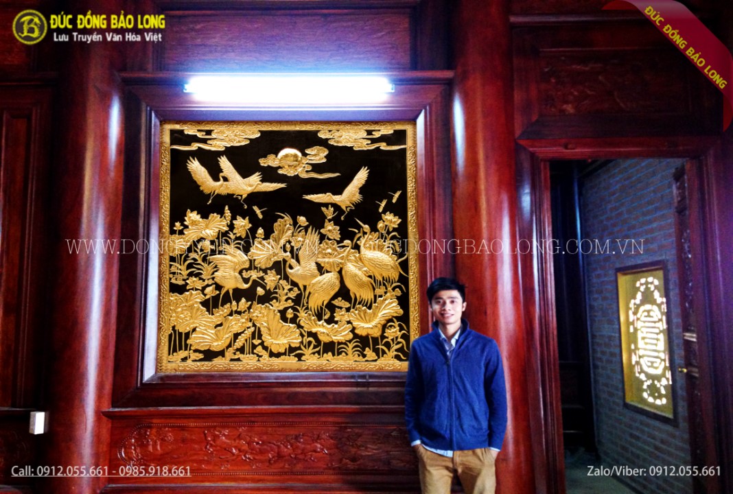 Vừa qua, cơ sở Bảo Long đã hoàn thiện và lắp đặt tranh sen hạc bằng đồng mạ vàng cho 1 ngôi nhà Gỗ xây theo lối cổ ở Phố Nối - Hưng Yên. Tranh thuộc loại hàng đặt theo yêu cầu của quý khách hàng. Kích thước tranh dài 1m84 cao 1m7. Tranh được chúng tôi chạm hoàn toàn thủ công từ phương pháp truyền thống, nguyên liệu là loại đồng vàng nguyên tấm dày 8rem được nhập khẩu Hàn Quốc. Khung gỗ gụ cực đẹp, toàn bộ nền tranh được mạ phủ vàng ròng 24k bằng phương pháp điện phân nhúng bể cao cấp nhất hiện nay.