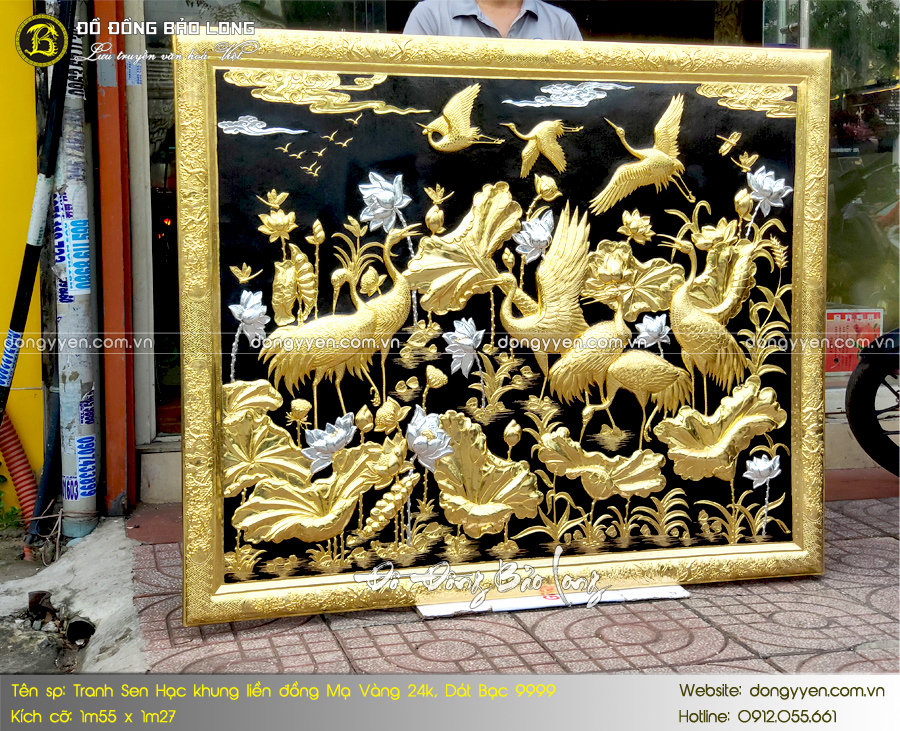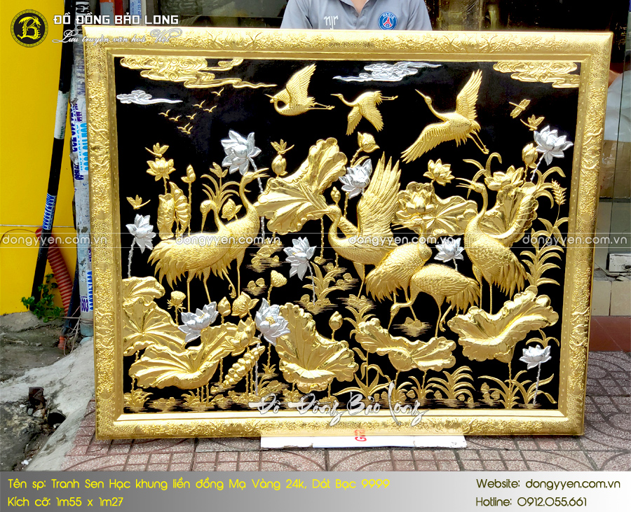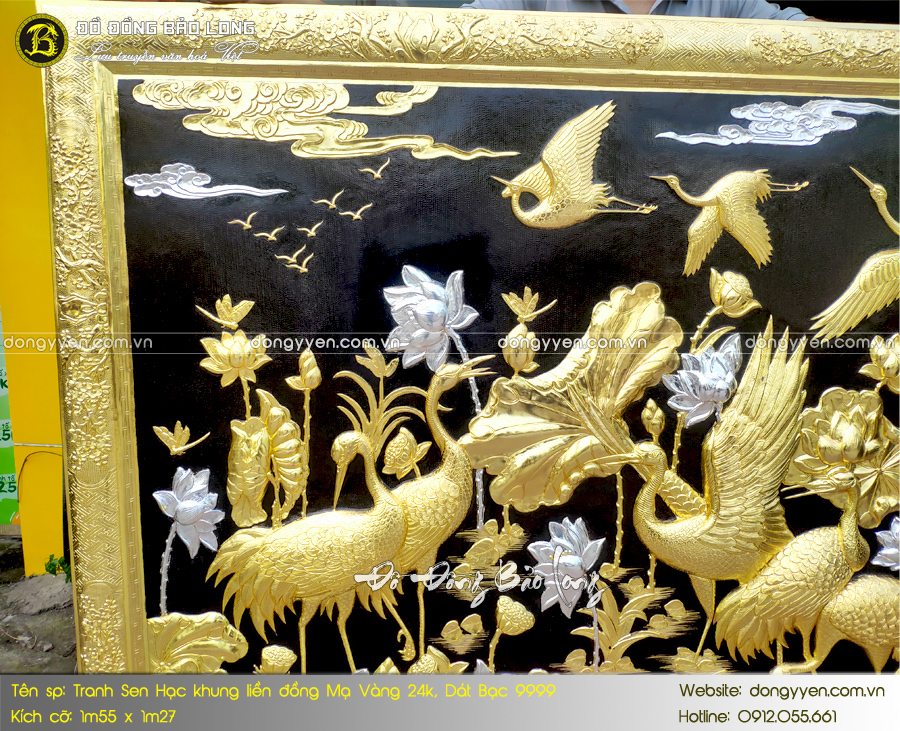 Tranh Sen Hạc mạ vàng dát bạc khung liền đồng 1m55 cho khách Sài Gòn