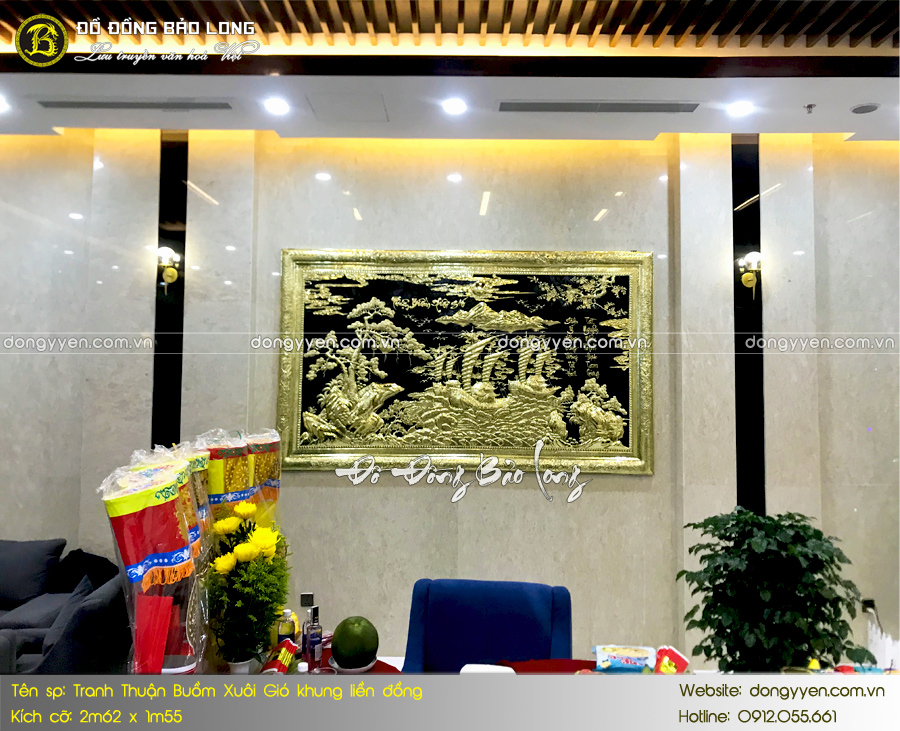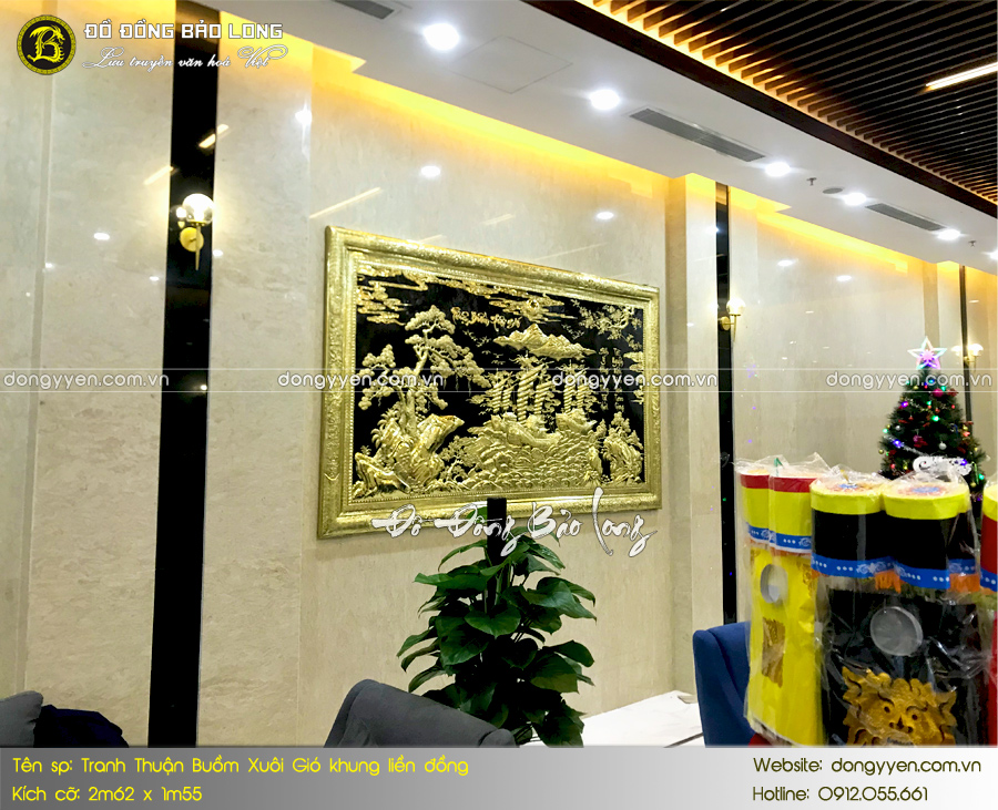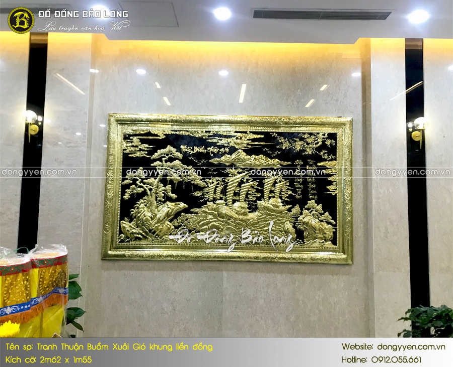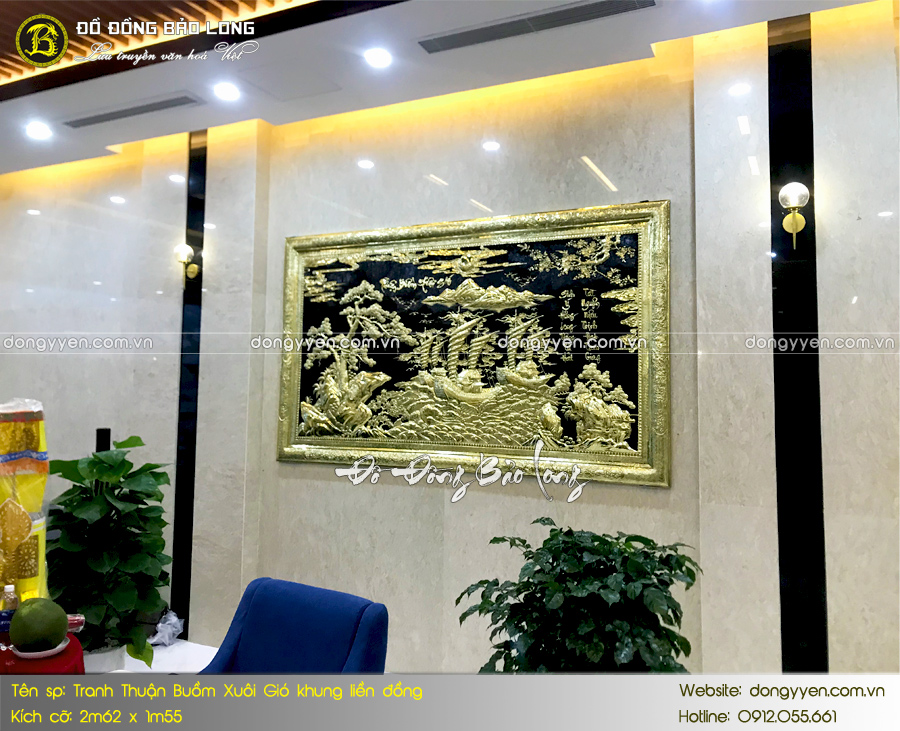 Tranh Thuận Buồm Xuôi khung liền đồng 2m62 x 1m55 cho khách Đà Nẵng đã được Bảo Long chế tác. Bức tranh được chế tác thủ công bởi các nghệ nhân lâu năm, màu sắc vàng nền đen. Tranh có khung liền đồng với lòng tranh, phía sau có thanh inox làm trục đỡ. Cùng với vẻ đẹp và ý nghĩa may mắn, đây là lựa chọn được rất nhiều người yêu thích treo trong nhà hay phòng làm việc.