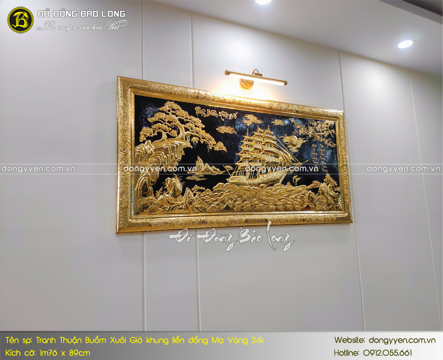 Tranh Thuận Buồm Xuôi Gió khung liền đồng mạ vàng 24k 1m76 x 89cm độc đáo, đẳng cấp. Bức tranh được chế tác thủ công bởi các nghệ nhân lâu năm, màu sắc vàng nền đen. Bức tranh dùng khung liền đồng nguyên tấm. Cùng với vẻ đẹp và ý nghĩa may mắn, đây là lựa chọn được rất nhiều người yêu thích treo trong nhà hay phòng làm việc.