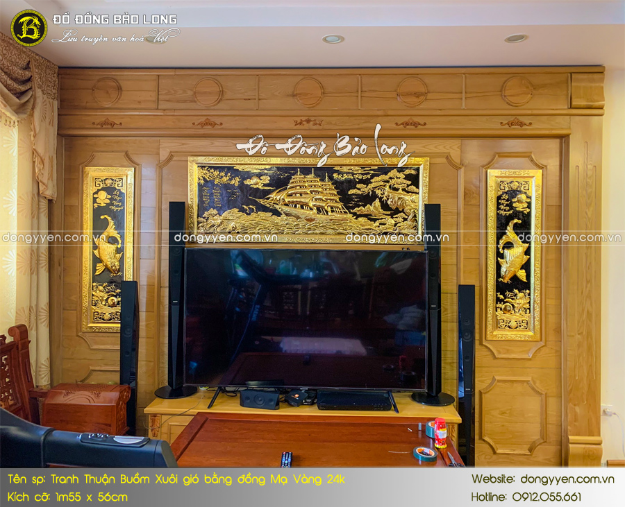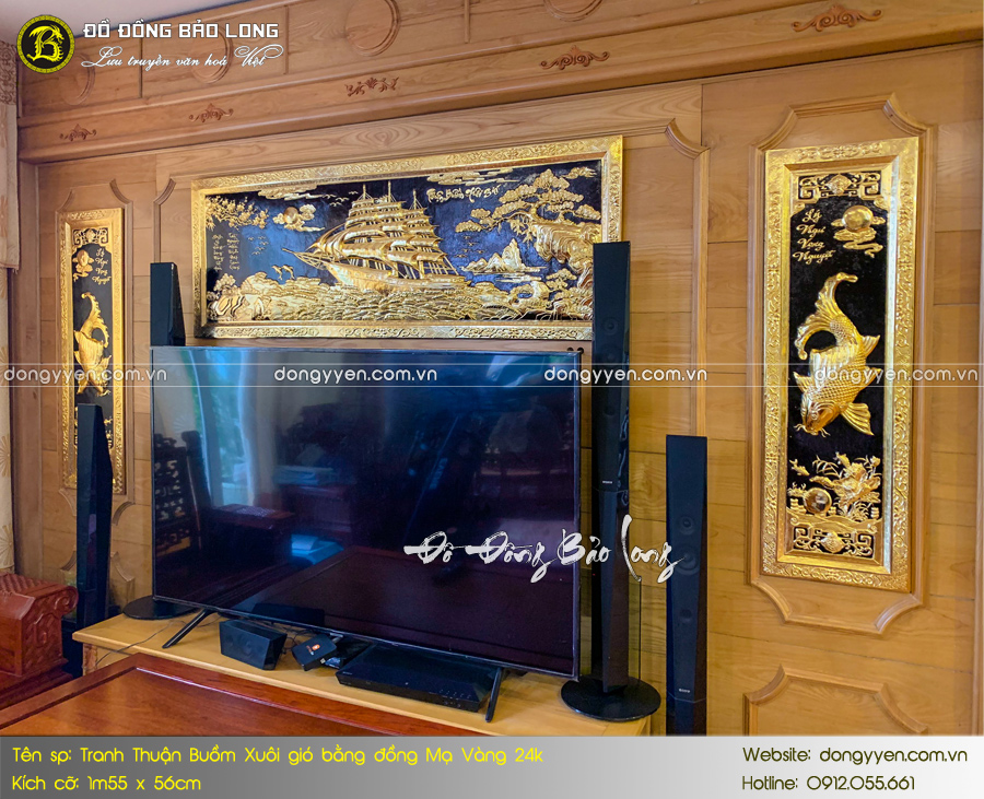 Tranh Thuận Buồm Xuôi mạ vàng 24k 1m55 x 56cm mới được Bảo Long hoàn thành và giao tới tay khách hàng. Bức tranh được chế tác thủ công bởi các nghệ nhân lâu năm, màu sắc vàng nền đen. Toàn bộ bề mặt được mạ vàng 24k cao cấp theo phương pháp hiện đại. Tranh có khung liền đồng với lòng tranh, phía sau có thanh inox làm trục đỡ. Cùng với vẻ đẹp và ý nghĩa may mắn, đây là lựa chọn được rất nhiều người yêu thích treo trong nhà hay phòng làm việc.