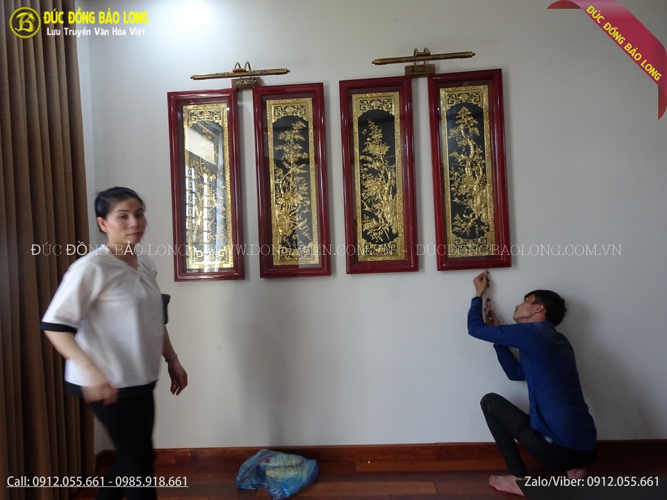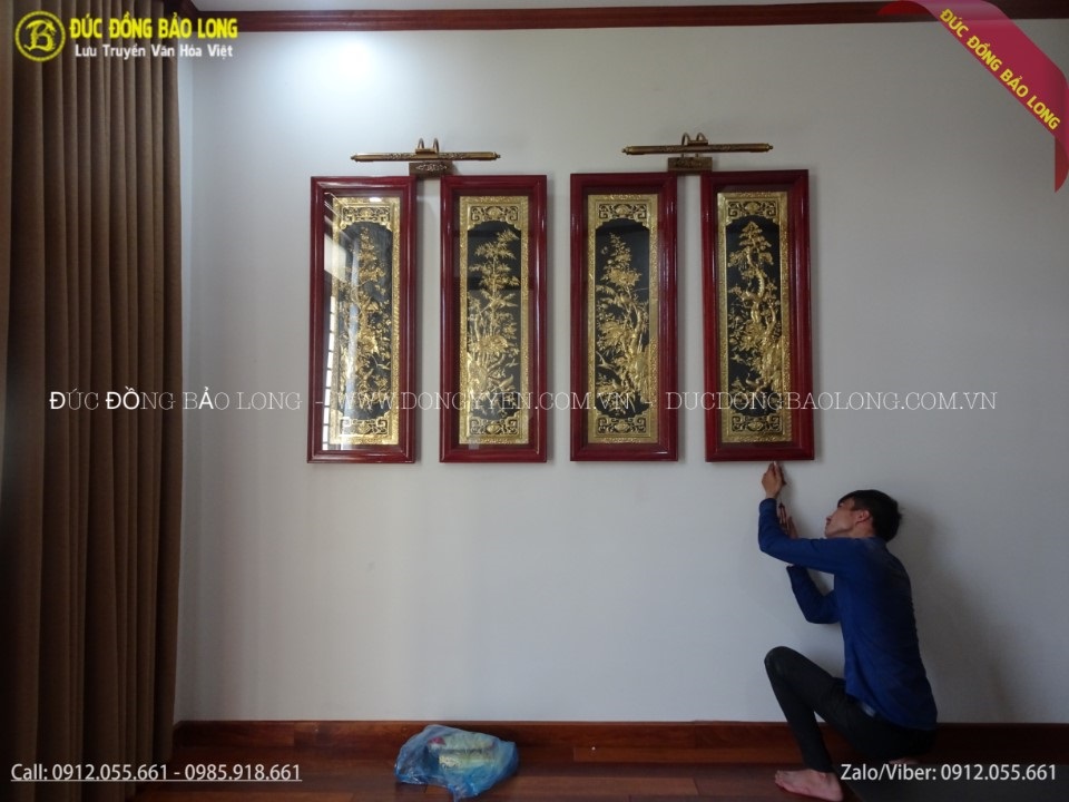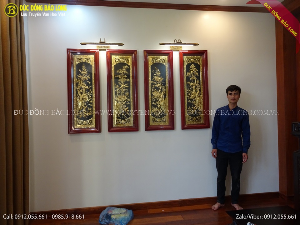 Bộ tranh tứ quý được chạm rời 4 bức riêng biệt Tùng Cúc Trúc Mai tượng trưng cho 4 mùa Xuân Hạ Thu Đông. Tranh tứ quý được dùng treo trang trí ở phòng thờ của 1 vị khách tại TP. Lào Cai. Bộ tứ quý được chạm hoàn toàn thủ công từ đồng vàng nhập khẩu Hàn Quốc, đồng dày 8rem, khung gỗ hương được tuyển trọn loại cao cấp. Đặc biệt hơn sản phẩm được mạ vàng 24k bằng phương pháp điện phân cao cấp nhất hiện nay.