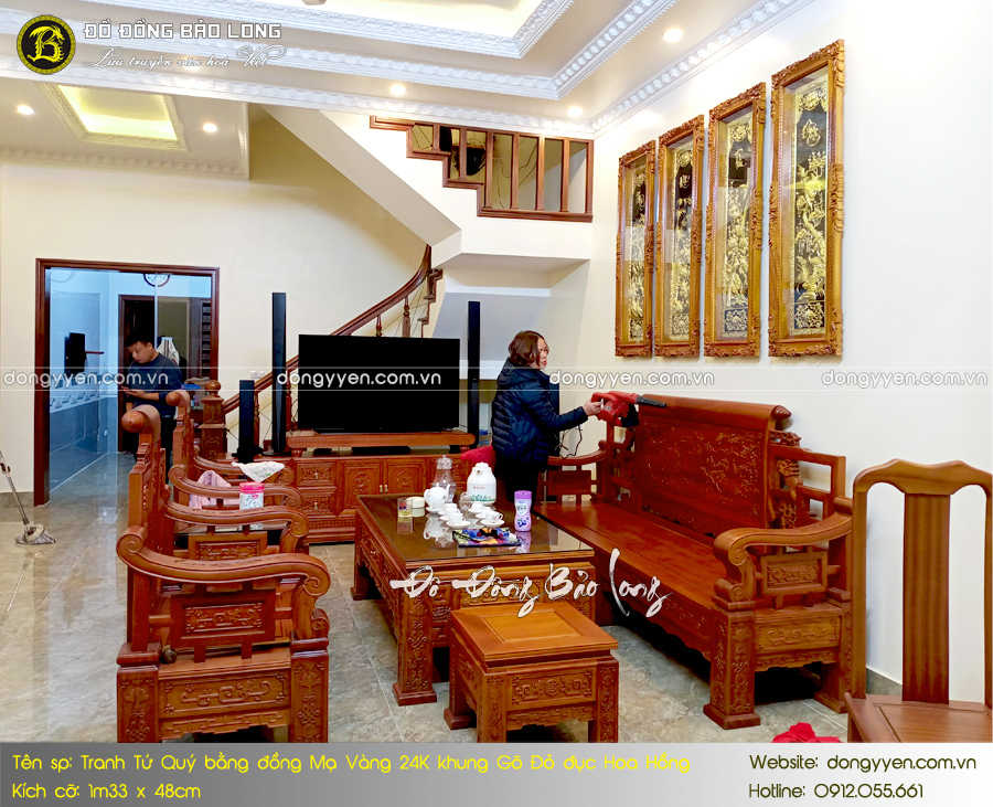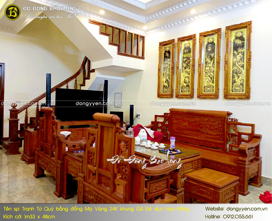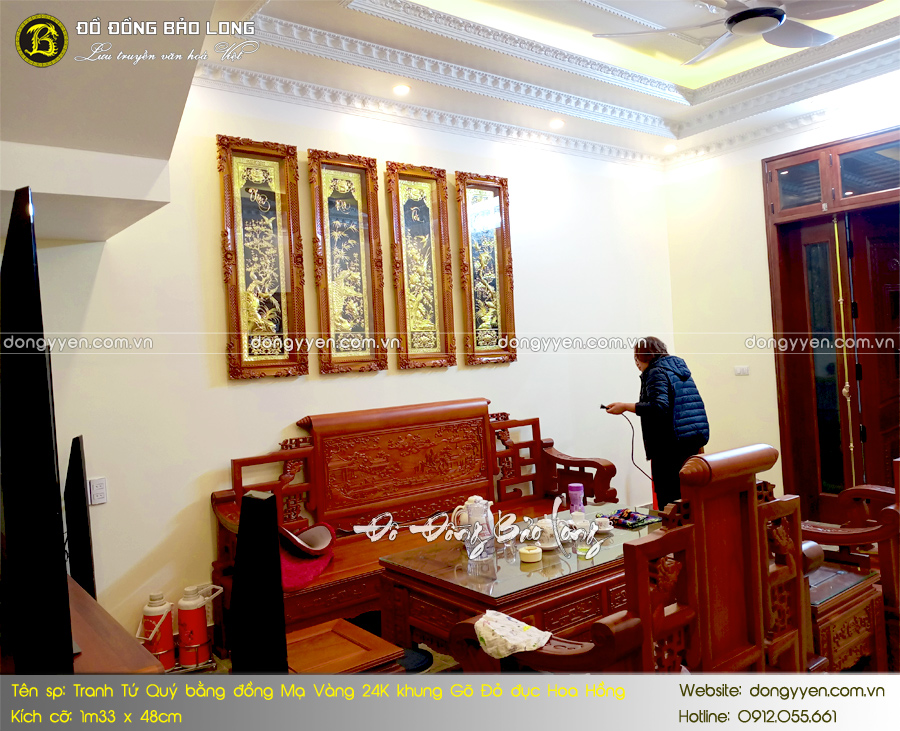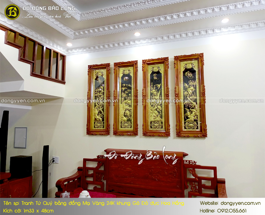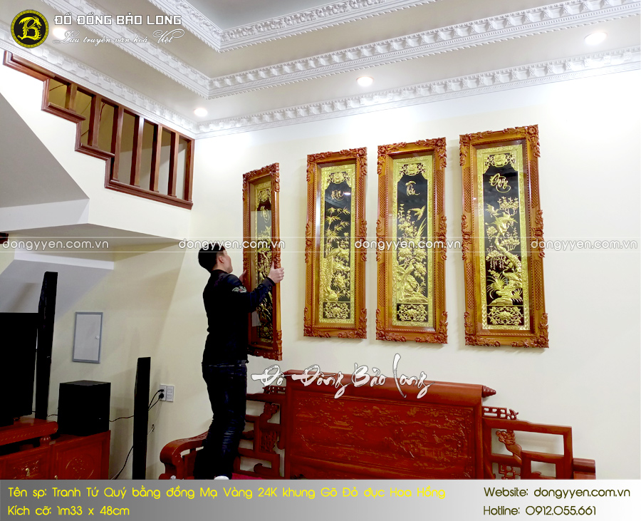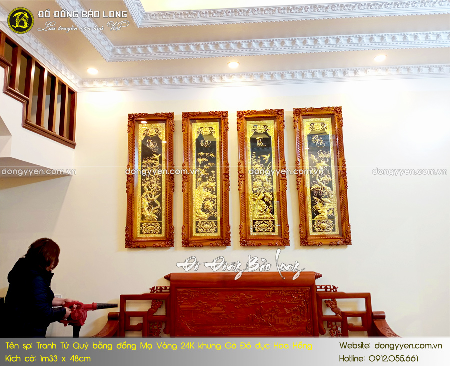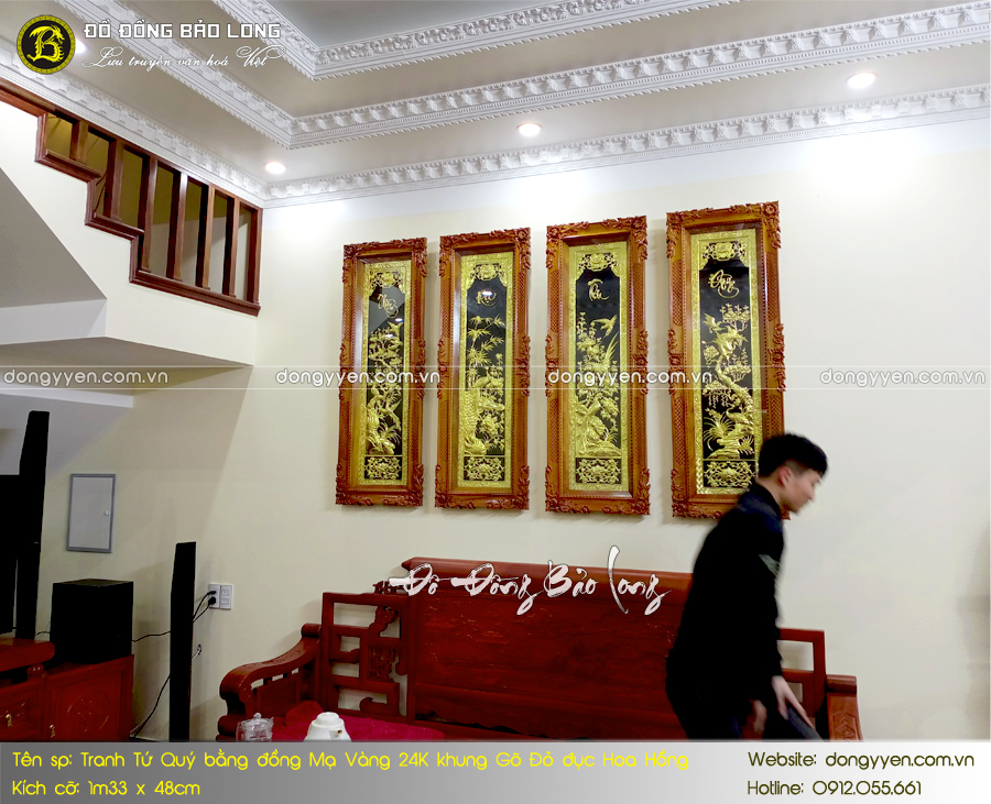 Tranh Tứ Quý mạ vàng 24k khung gỗ gõ 1m33 cho khách Quỳnh Côi có vẻ ngoài độc đáo, ý nghĩa. Bộ tranh gồm 4 bức, tái hiện 4 mùa xuân hạ thu đông. Bức tranh không chỉ tăng vẻ đẹp cho không gian mà còn biểu thị cho sự luân chuyển của 4 mùa, cho dòng chảy thời gian, chỉ sự hoàn hảo, may mắn.