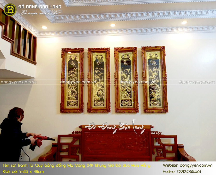 Bộ tranh Tứ Quý mạ vàng 1m33 được chúng tôi chế tác hoàn toàn thủ công từ nguyên liệu đồng vàng tinh xảo và đẹp mắt. Bộ tranh được chế tác 4 bức rời riêng biệt nhau. Các bức tranh được chạm rất tỉ mỉ và sắc nét. Khung tranh được chúng tôi lựa chọn loại gỗ gõ đỏ đục hoa hồng độc đáo, chắc chắn. Qúy khách có thể lựa chọn khung tùy ý như gỗ hương, gỗ gụ, gỗ trò chỉ,....