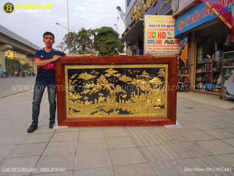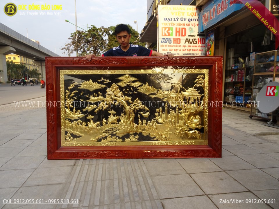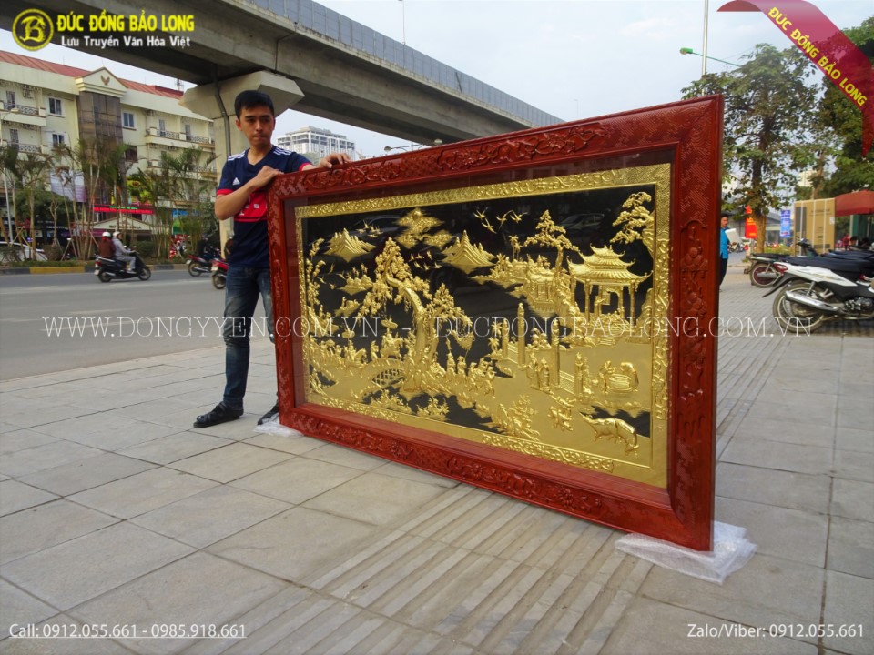 Tranh được các nghệ nhân của Bảo Long chạm tay hoàn toàn thủ công rất tỉ mỉ tâm huyết nên tinh xảo, sắc nét đến từng chi tiết nhỏ. Nguyên liệu đồng vàng nguyên tấm nhập khẩu tại Hàn Quốc, đồng dày 8rem, khung gỗ tuyển trọn đẹp không tỳ vết. Lòng tranh được mạ phủ vàng ròng 24k bằng phương pháp điện phân nhúng bể 3 lớp cho màu sắc cực đẹp với độ bền cực cao. Khung tranh được làm bằng gỗ gụ tuyển trọn đục tứ quý tùng cúc trúc mai.