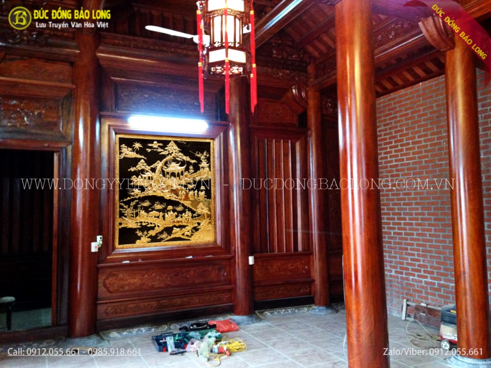 Vừa qua, cơ sở Bảo Long đã hoàn thiện và lắp đặt tranh vinh quy bái tổ bằng đồng mạ vàng cho 1 ngôi nhà Gỗ xây theo lối cổ ở Phố Nối - Hưng Yên. Tranh thuộc loại hàng đặt theo yêu cầu của quý khách hàng. Kích thước tranh dài 1m87 cao 1m7. Tranh được chúng tôi chạm hoàn toàn thủ công từ phương pháp truyền thống, nguyên liệu là loại đồng vàng nguyên tấm dày 8rem được nhập khẩu Hàn Quốc. Khung gỗ gụ cực đẹp, toàn bộ nền tranh được mạ phủ vàng ròng 24k bằng phương pháp điện phân nhúng bể cao cấp nhất hiện nay.