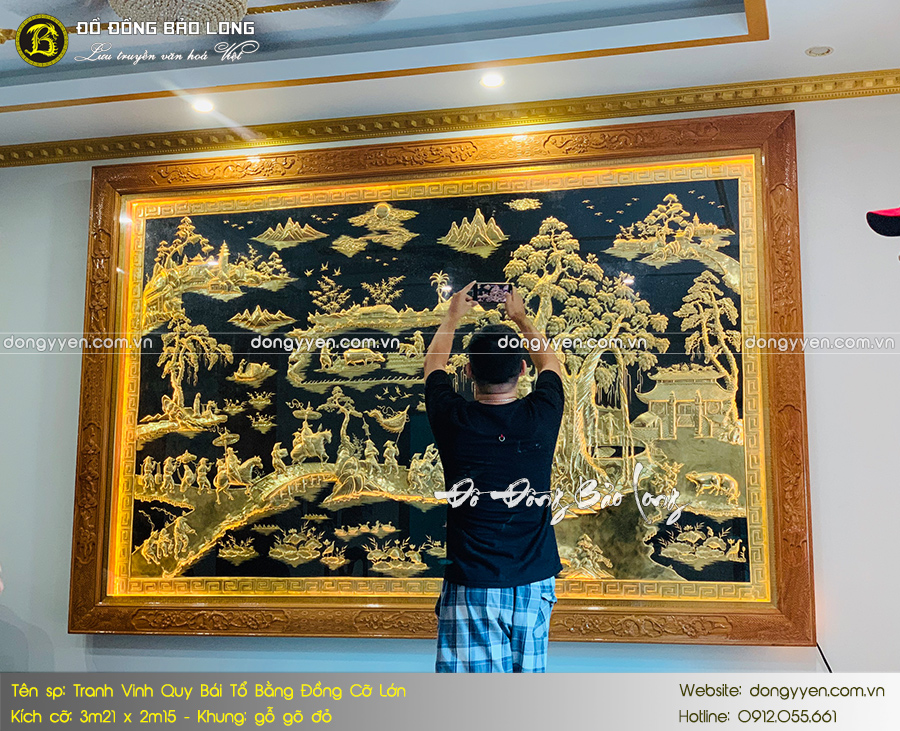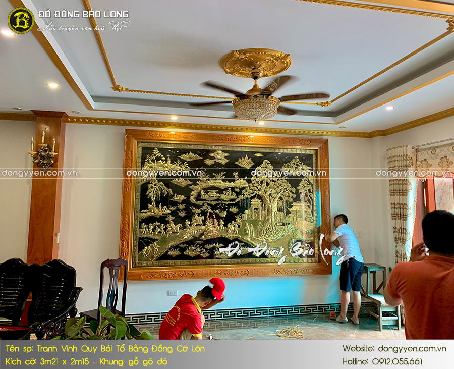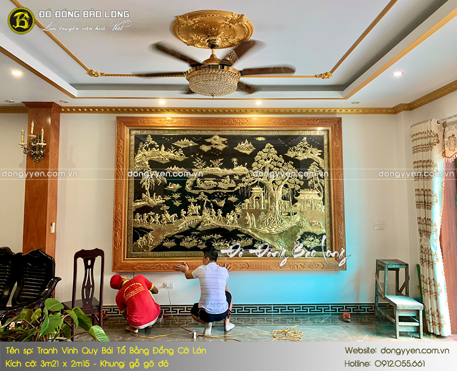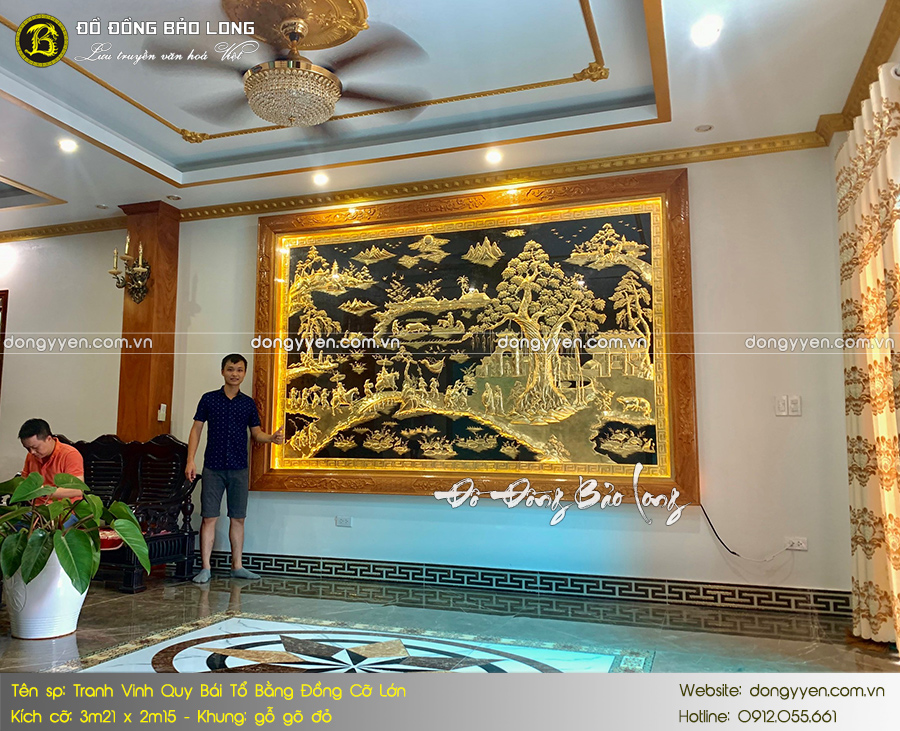 Tranh Vinh Quy Bái Tổ bằng đồng khung gỗ gõ 3m21 x 2m15 được chế tác thủ công hoàn toàn. Bức tranh khổ lớn, 4 cạnh có hệ thống đèn Led tăng vẻ đẹp.