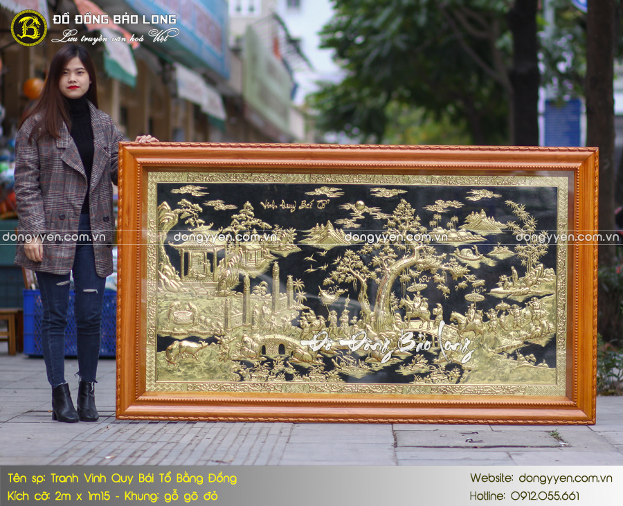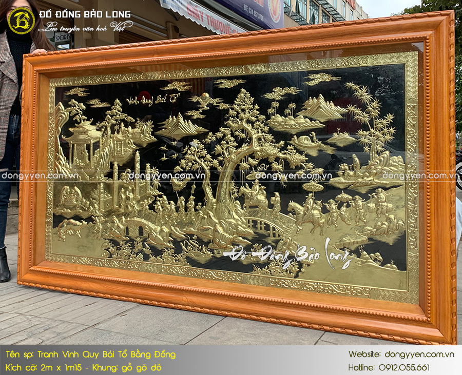 Tranh Vinh Quy Bái Tổ khung gỗ gõ đỏ 2m x 1m15 được chạm tay thủ công từ tấm đồng nguyên nhập khẩu Hàn Quốc. Sản phẩm có kiểu dáng đẹp, chất lượng tốt.
