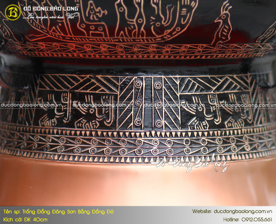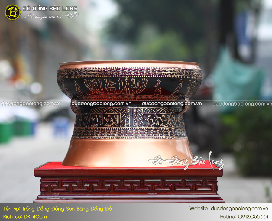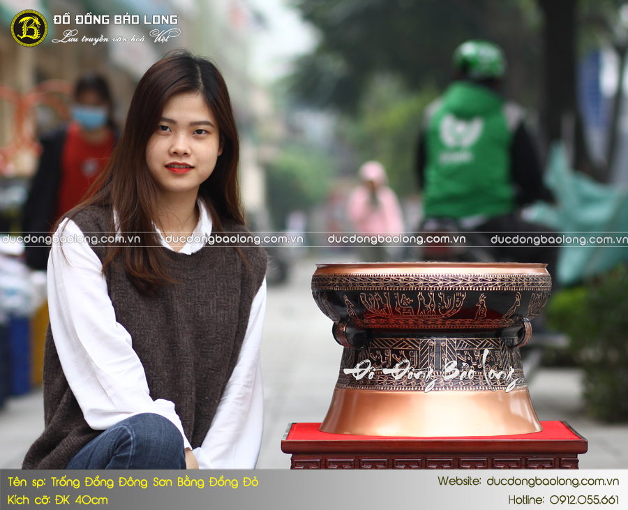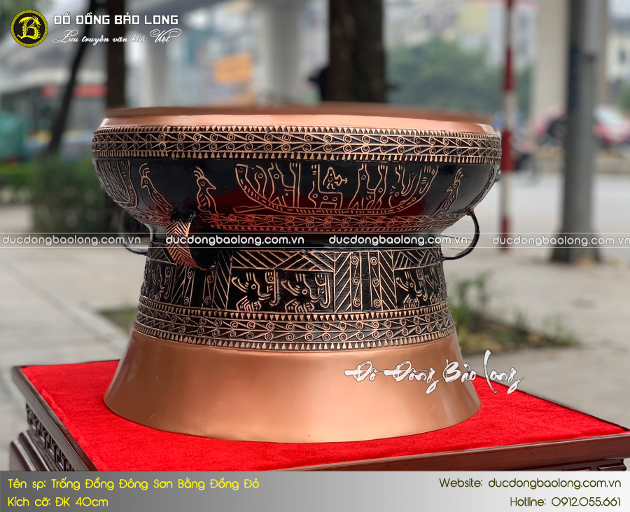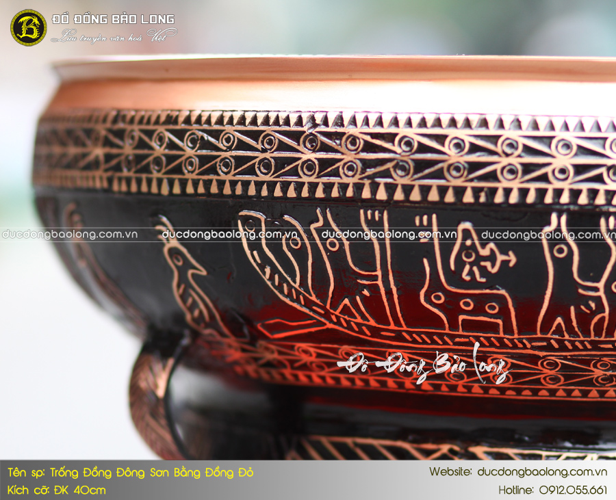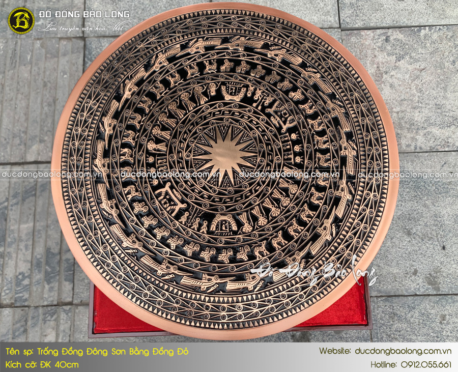 Mẫu Trống Đồng Đông Sơn bằng đồng đỏ đường kính 40cm được đúc thủ công bởi nghệ nhân cơ sở Đúc Đồng Bảo Long. Sản phẩm được đánh giá cao bởi hình khối cân đối, đúc chuẩn với họa tiết hoa văn tinh xảo, bắt mắt. Với đường kính 40cm, vật phẩm thích hợp để trưng bày trong nhiều không gian như phòng khách, phòng làm việc, sảnh công ty hay làm quà biếu tặng cao cấp.
