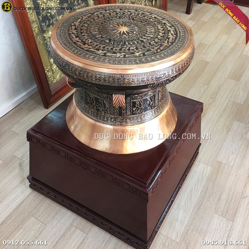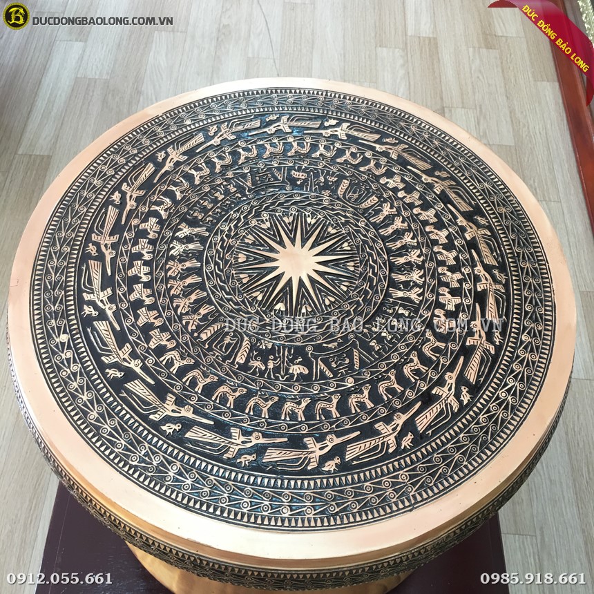 Đây là mẫu trống đồng Đông Sơn hoa văn nổi được đúc thủ công hoàn toàn bằng đồng đỏ thanh khiết, đường nét hoa văn sắc nét, đường kính 50cm nặng chừng gần 50kg đồng, cao gần 50cm. Trống Đồng Đông Sơn 50cm không chỉ là vật phẩm độc đáo bày trang trí phòng khách, phòng làm việc mà nó còn có tác dụng gìn giữ và lưu truyền văn hóa Việt Nam xưa.