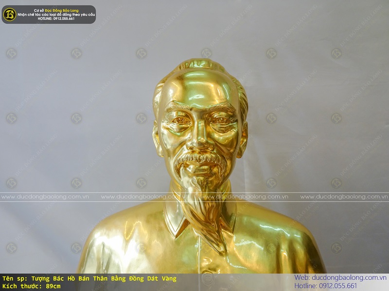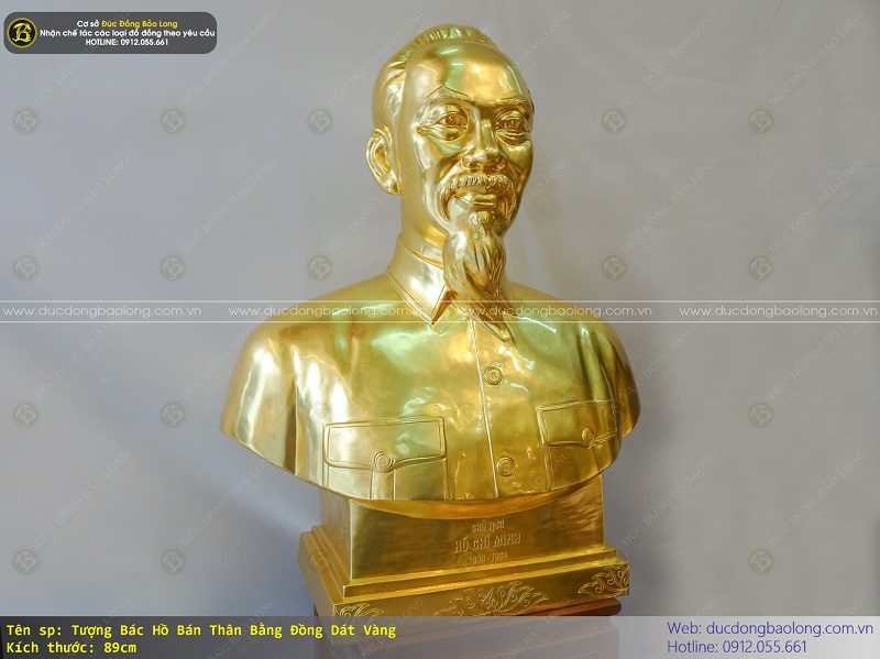Mẫu tượng Bác Hồ bán thân bằng đồng 89cm dát vàng 9999 là mẫu tượng đồng cao cấp có kích thước khá lớn, tượng có hình khối chuẩn, chạm sắc nét nên được rất nhiều khách hàng lựa chọn sử dụng.