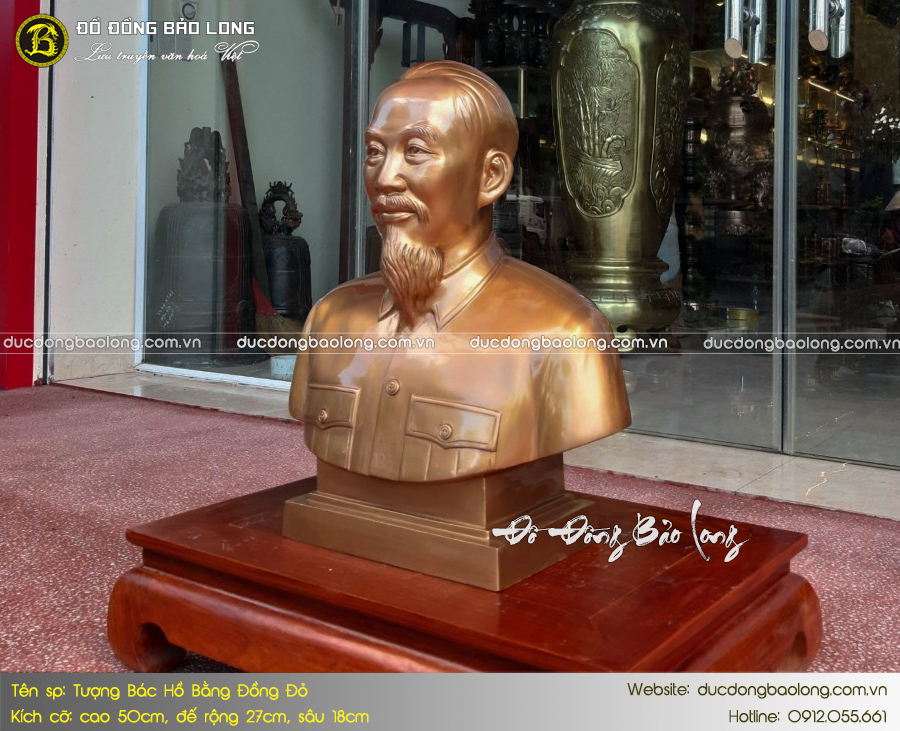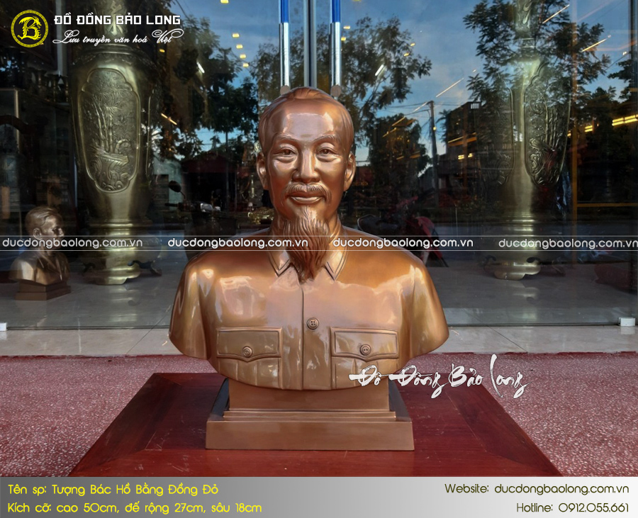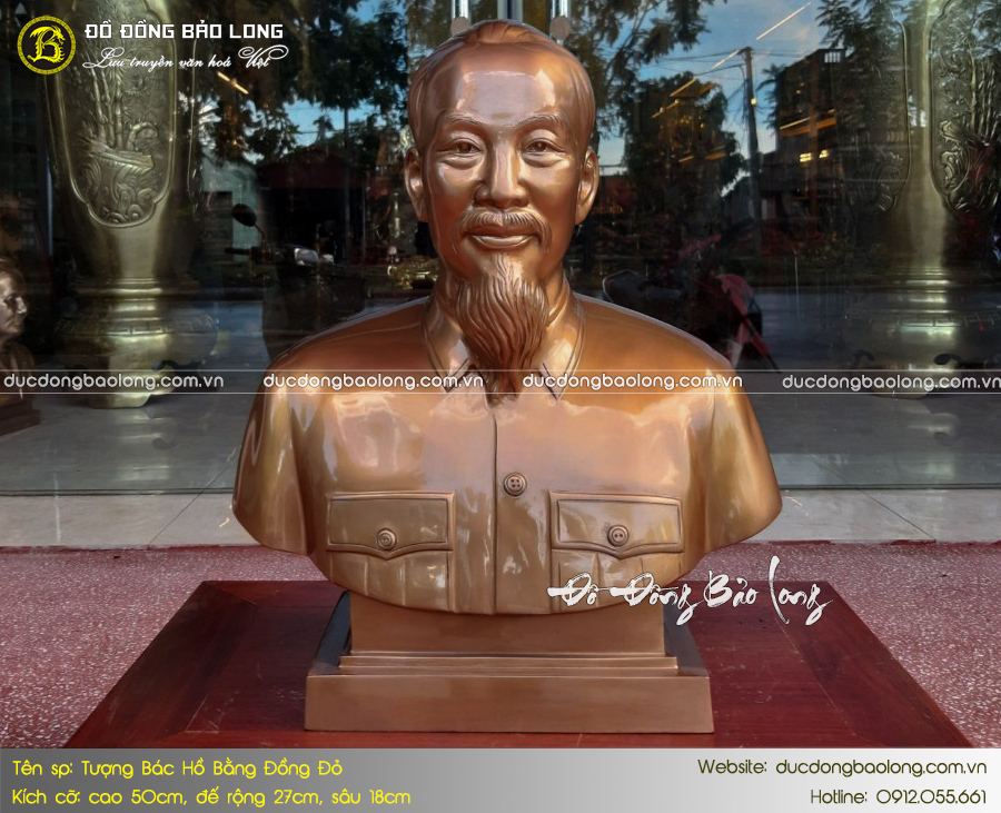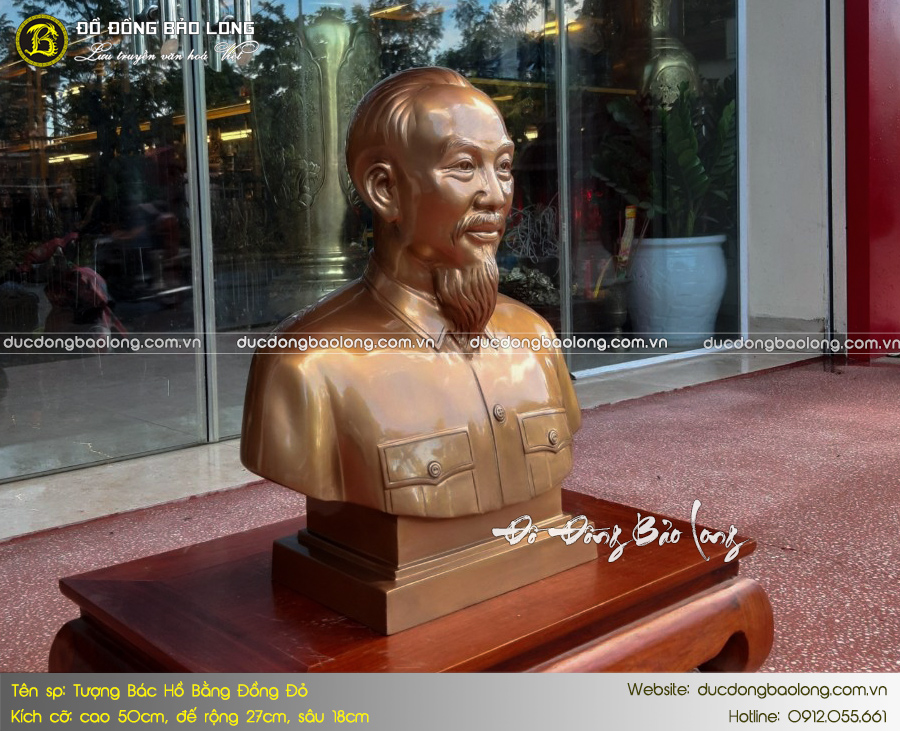 Mẫu tượng Bác Hồ bán thân bằng đồng 50cm được nhiều khách hàng yêu thích và lựa chọn. Pho tượng có chất lượng hoàn thiện tốt, diện mặt thần thái, hình khối cân đối và được chế tác dựa theo tư liệu quốc gia cung cấp. Đây là một trong những mẫu tượng mới nhất, được chế tác bởi nghệ nhân cơ sở Đúc Đồng Bảo Long.