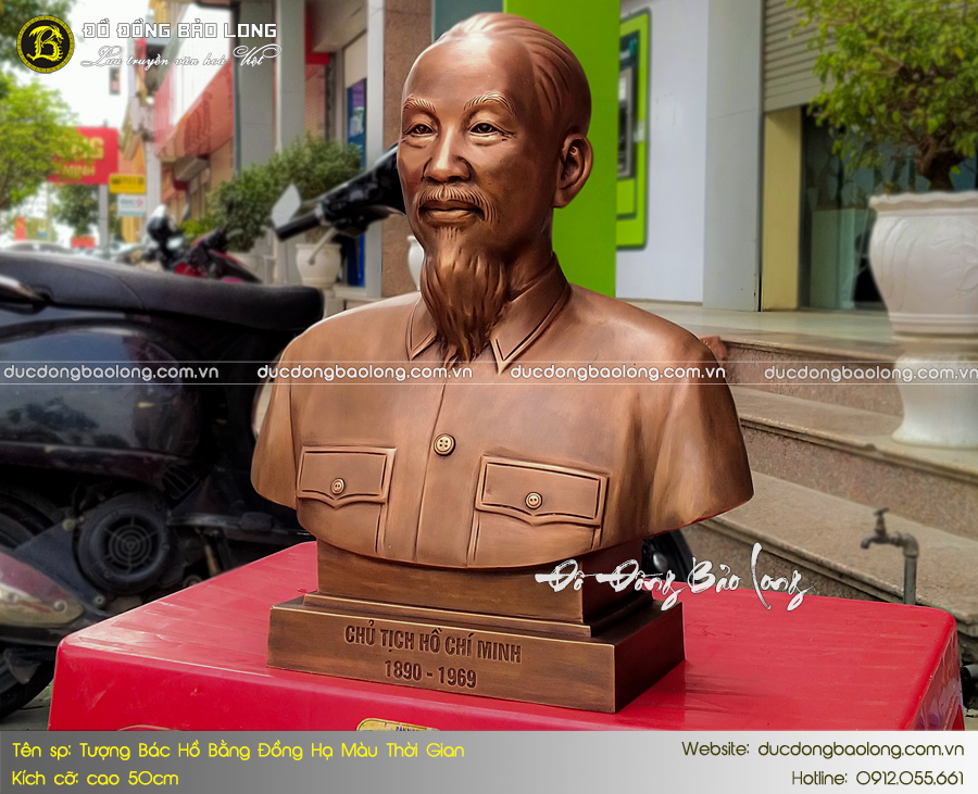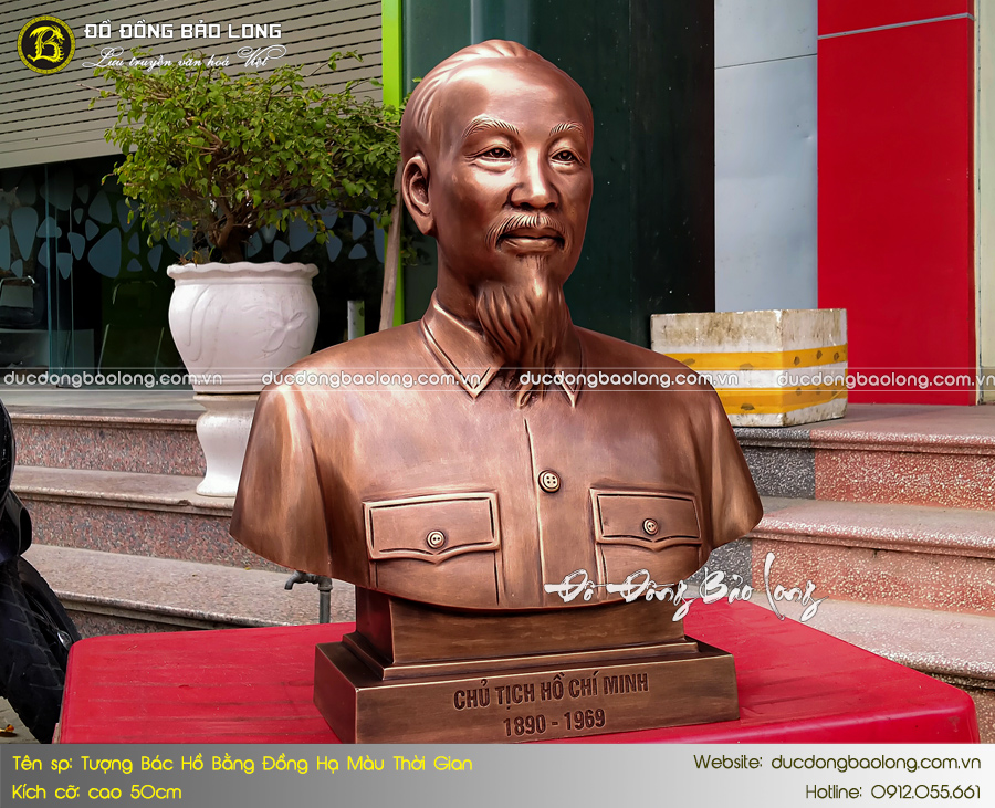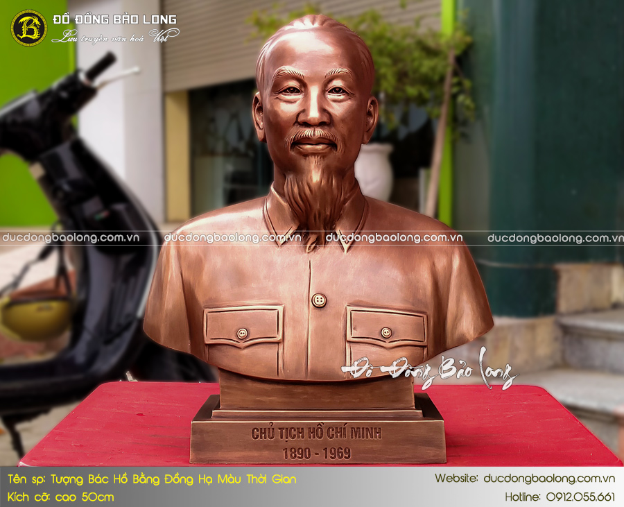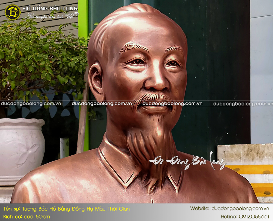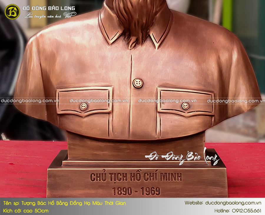 Tượng Bác Hồ bán thân bằng đồng đỏ hạ màu thời gian cao 50cm được chế tác và hoàn thiện bởi các nghệ nhân cơ sở Đúc Đồng Bảo Long. Tượng có diện mạo đẹp, thần thái, chất lượng hoàn thiện bề mặt tốt với màu sắc trầm cổ độc đáo.