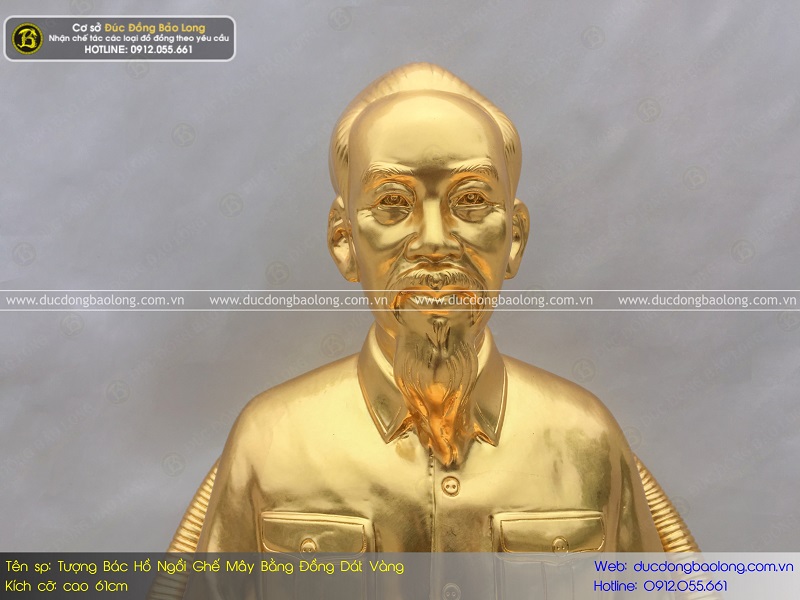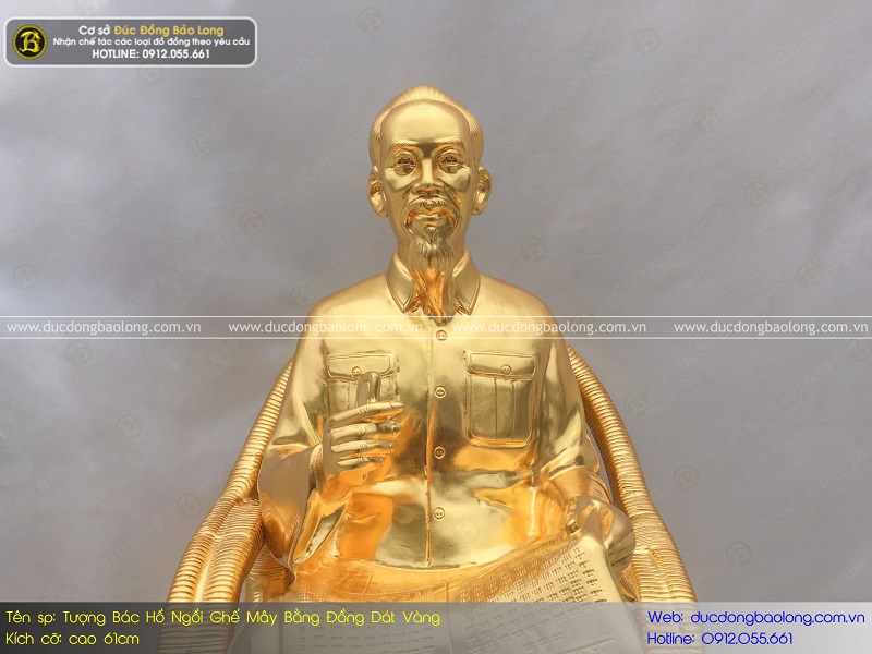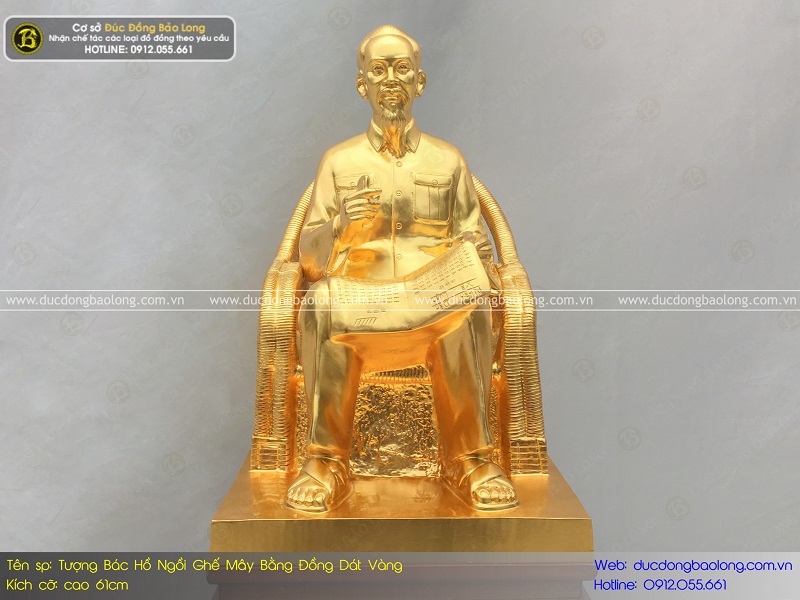 Đây là mẫu tượng Bác Hồ ngồi ghế mây bằng đồng đỏ 61cm dát vàng cực đẹp được cơ sở Đúc Đồng Bảo Long lên hình khối và tạo mẫu. Hiện mẫu tượng này đã được nhiều khách hàng tin tưởng sử dụng.