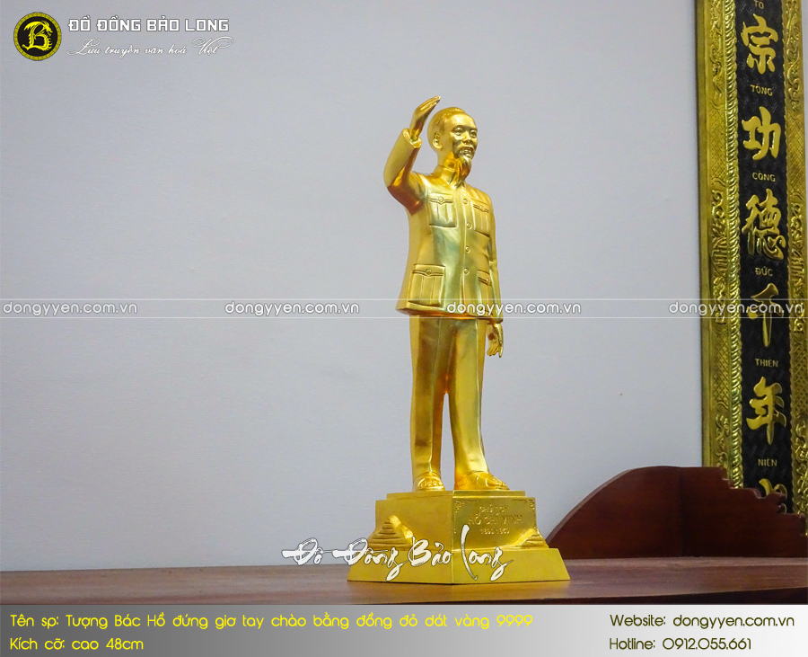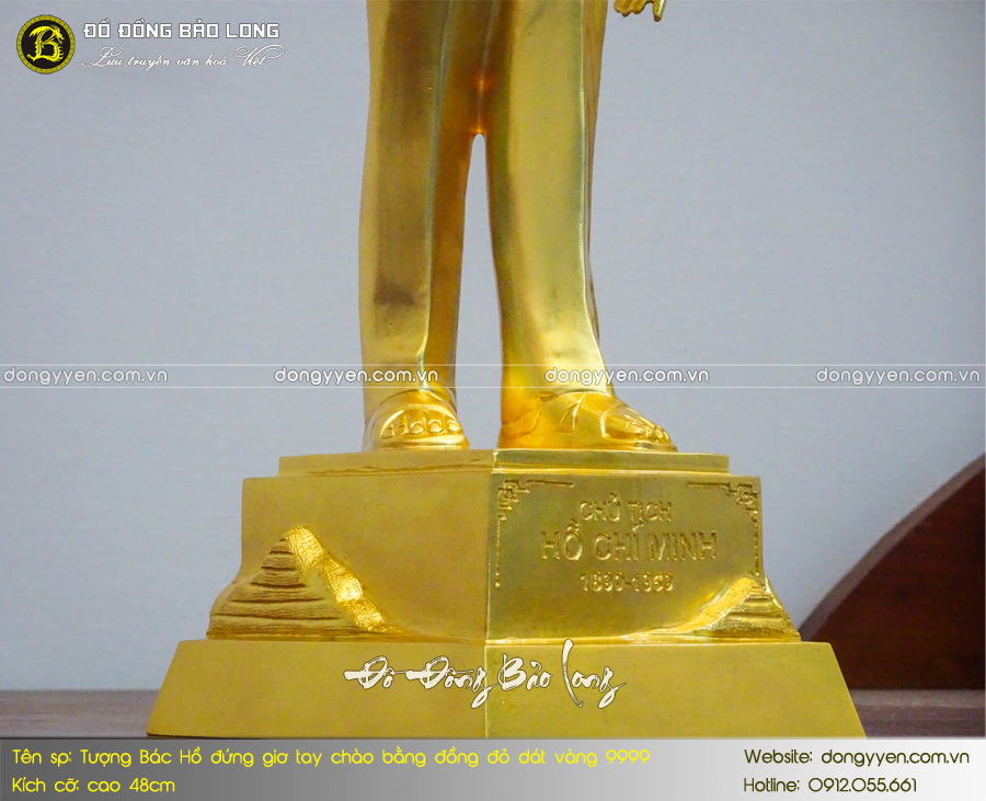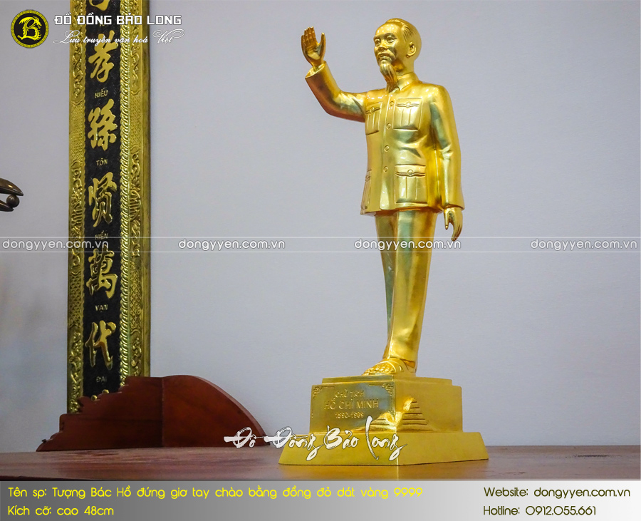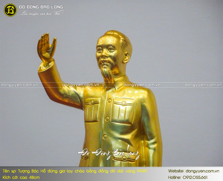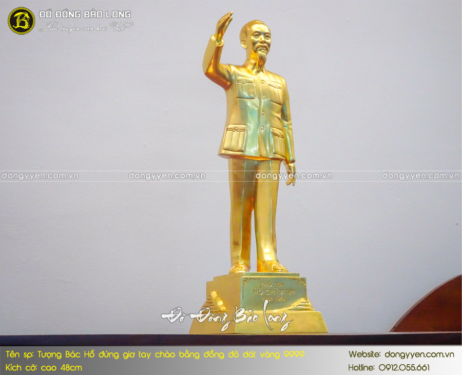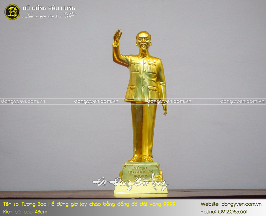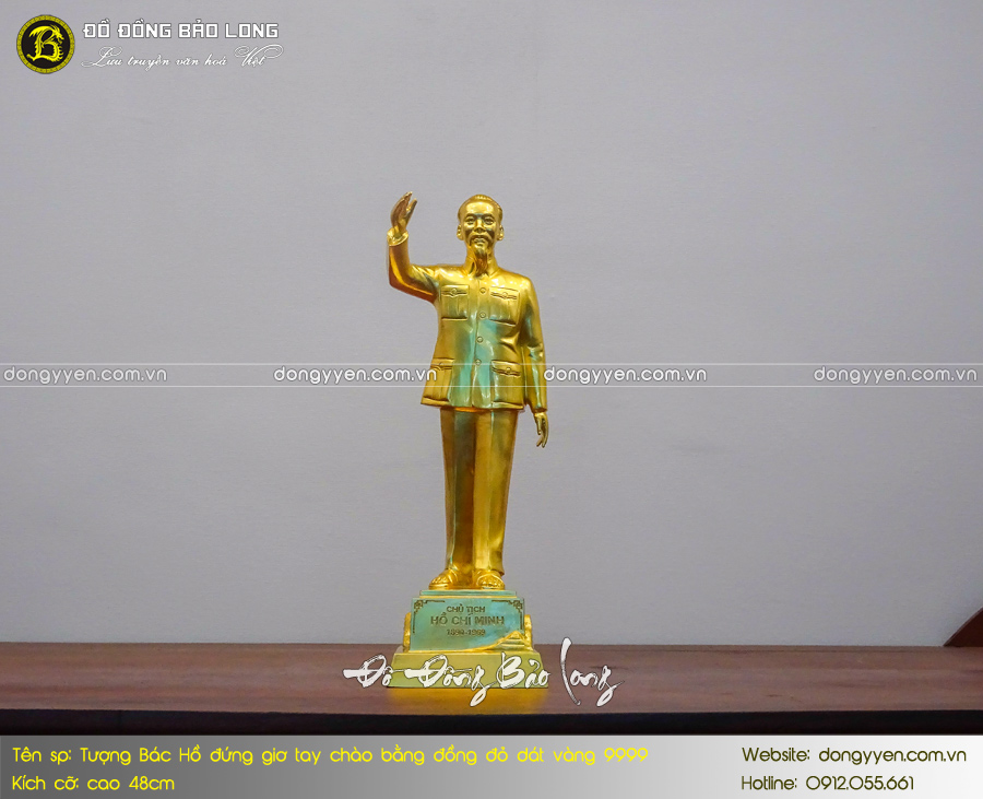 Tượng Bác Hồ vẫy tay chào bằng đồng dát vàng 9999 48cm có kiểu dáng đẹp, chất lượng cao cấp. Sản phẩm thích hợp bày tại phòng làm việc, phòng khách,...