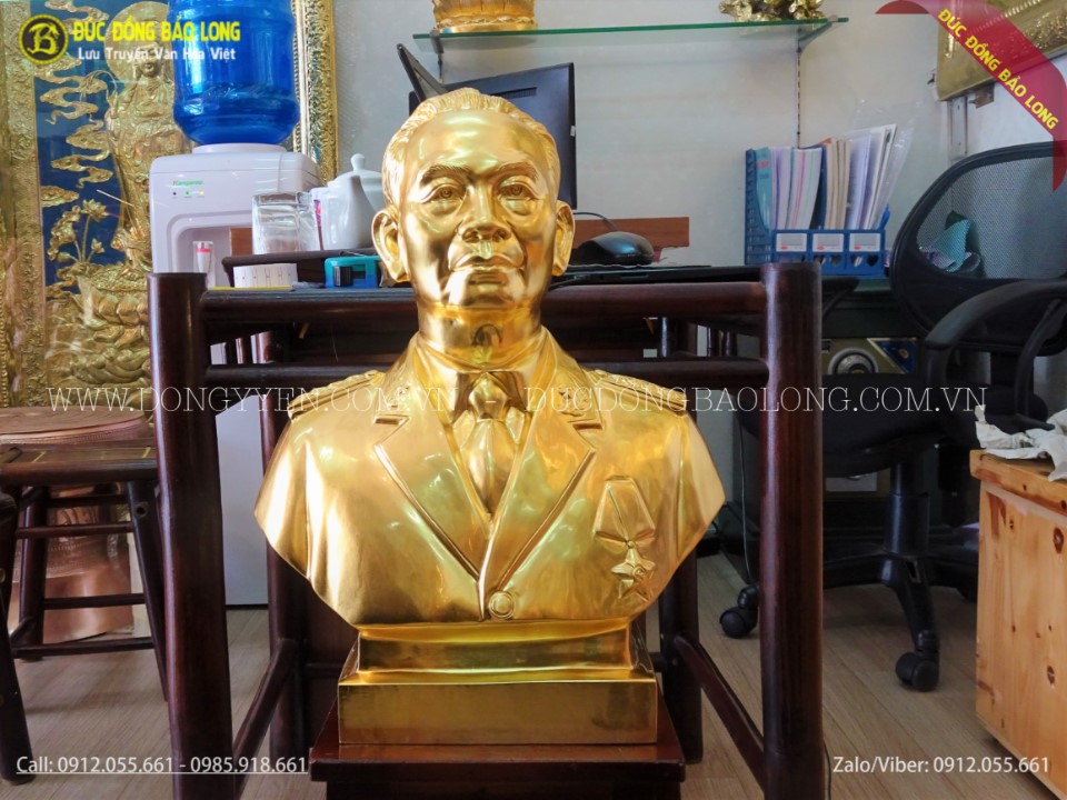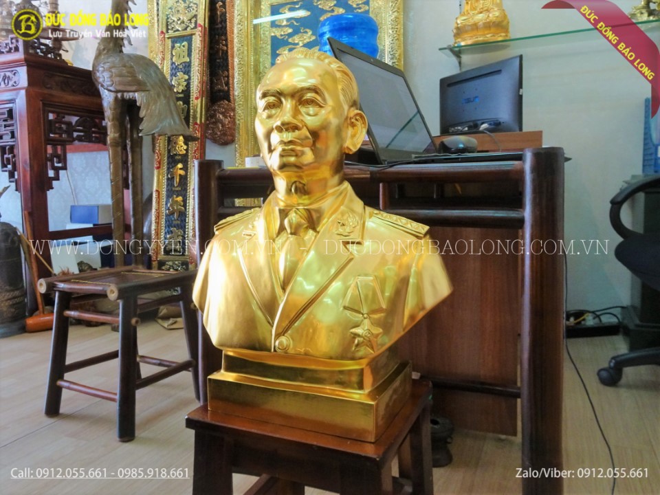 Chúng tôi xin giới thiệu tới quý khách hàng mẫu tượng chân dung bác Giáp bằng đồng dát vàng cao 45cm được đánh giá là đẹp nhất, giống bác và có hồn nhất hiện nay. Tượng được đúc hoàn toàn thủ công từ nguyên liệu đồng đỏ thanh khiết, được cơ sở Bảo Long chế tác trên mẫu chuẩn, phù màu vàng ngũ sáng cực đẹp. Đế tượng được thiết kế hình vuông có chạm chữ và họa tiết để trang trí. Toàn bộ sản phẩm được dát vàng 9999 cho màu vàng sáng rất đẹp và sang.