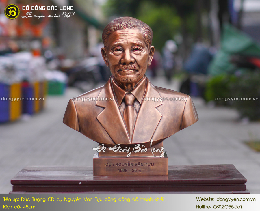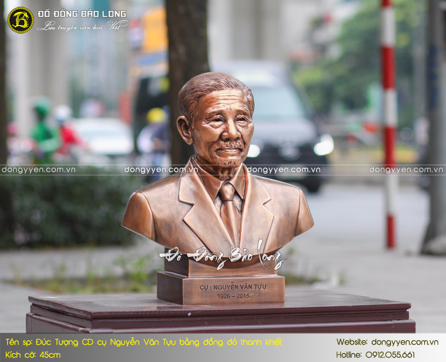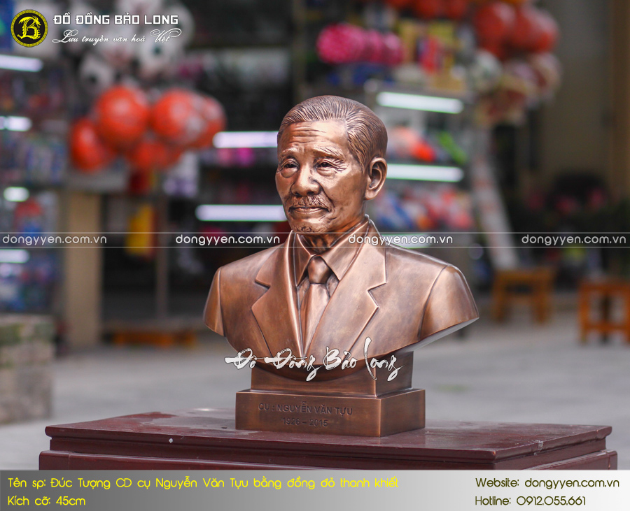 Tượng chân dung cụ Nguyễn Văn Tựu bằng đồng đỏ cao 45cm là mẫu tượng mới nhất của Bảo Long chuyển tới tay khách hàng. Sản phẩm dược chế tác từ đồng đỏ thanh kiết, hoàn toàn thủ công 100%. Tượng có kiểu dáng bán thân, màu sắc hạ màu thời gian, giống nguyên mẫu thật tới 90%.
